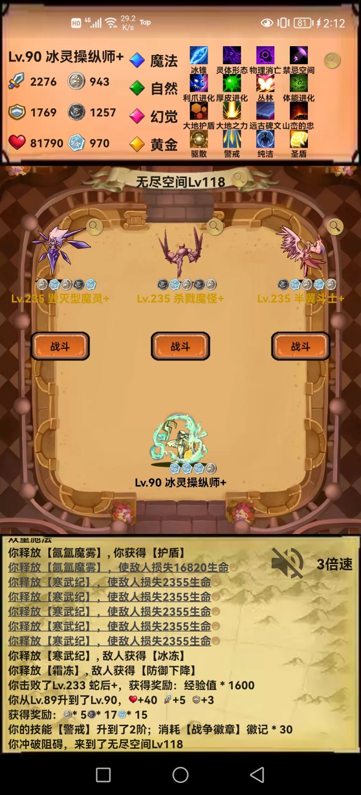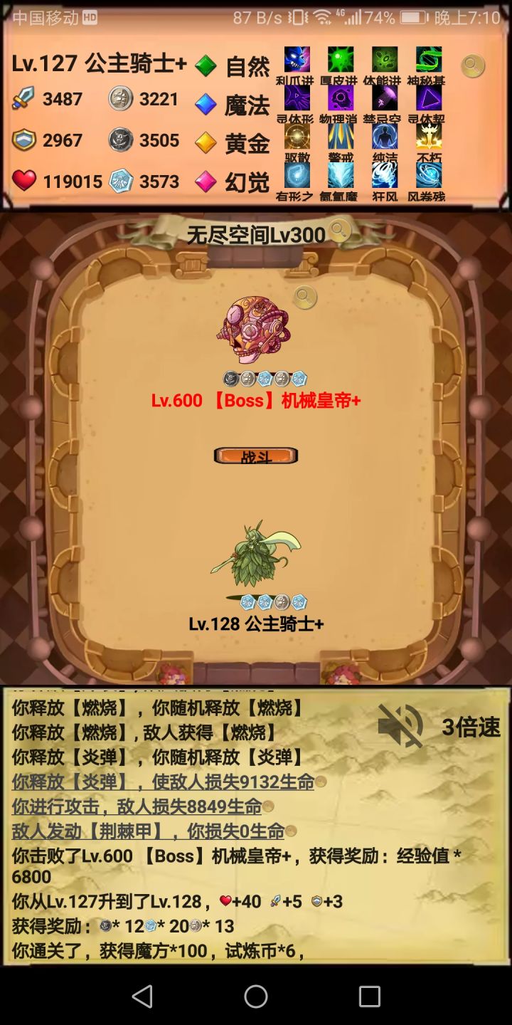 核心思想:拖,就硬拖。免真伤、免技能伤害、免死后回满血、每回合回血、20回合自动胜利。除非你能平a一刀秒我23w血