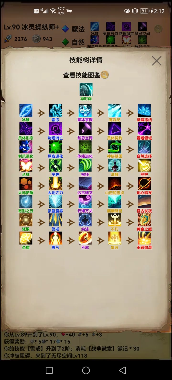 前50级🐶,50级前靠月光系输出,上无尽后补出魔法系主要靠冰锥和灵体两系技能打真实伤害和技能伤害靠着血月升腾+法力灵柩+新生的combo打生存除了新生要求一级,尽早凑combo,别的没太大要求秘术弹射可以根据需要换魔法系或者机械系其他输出技能
