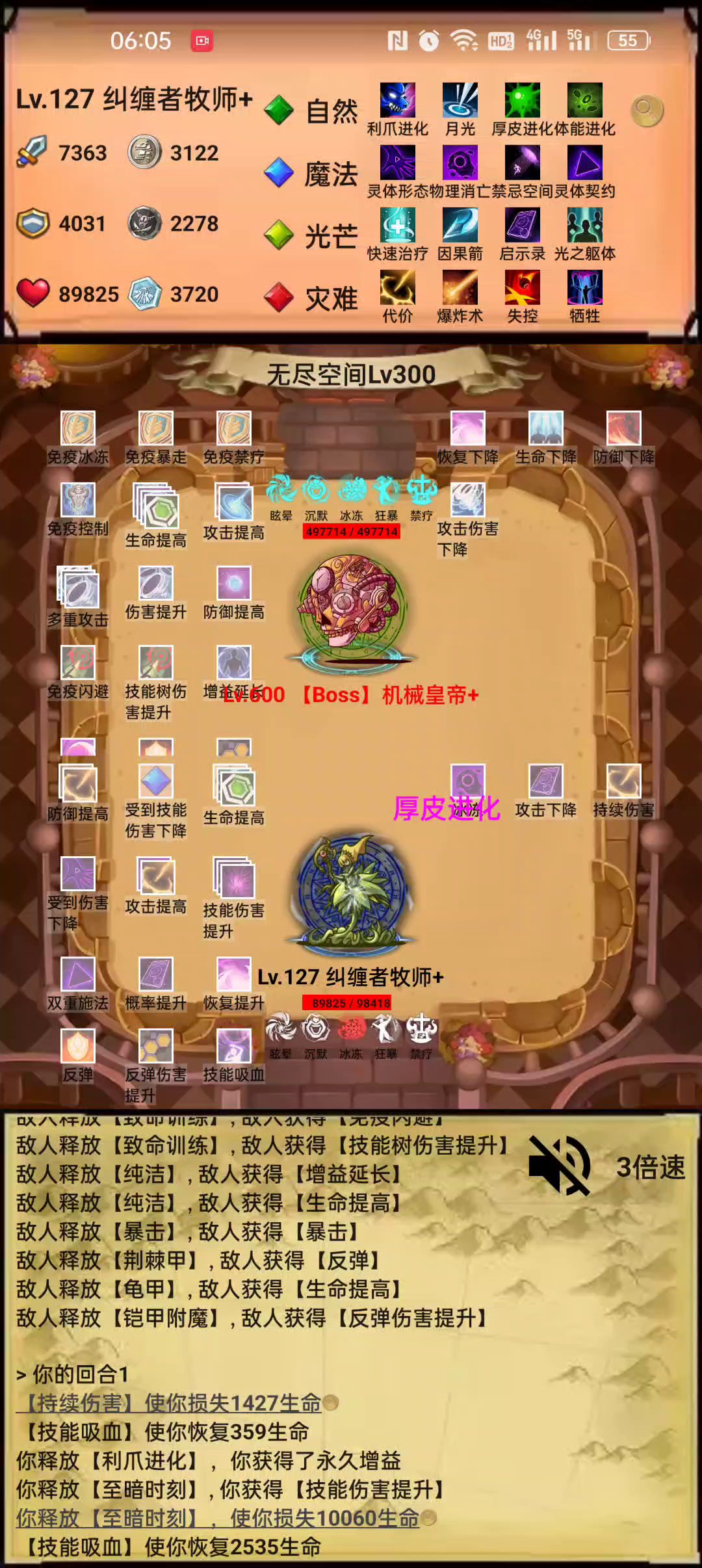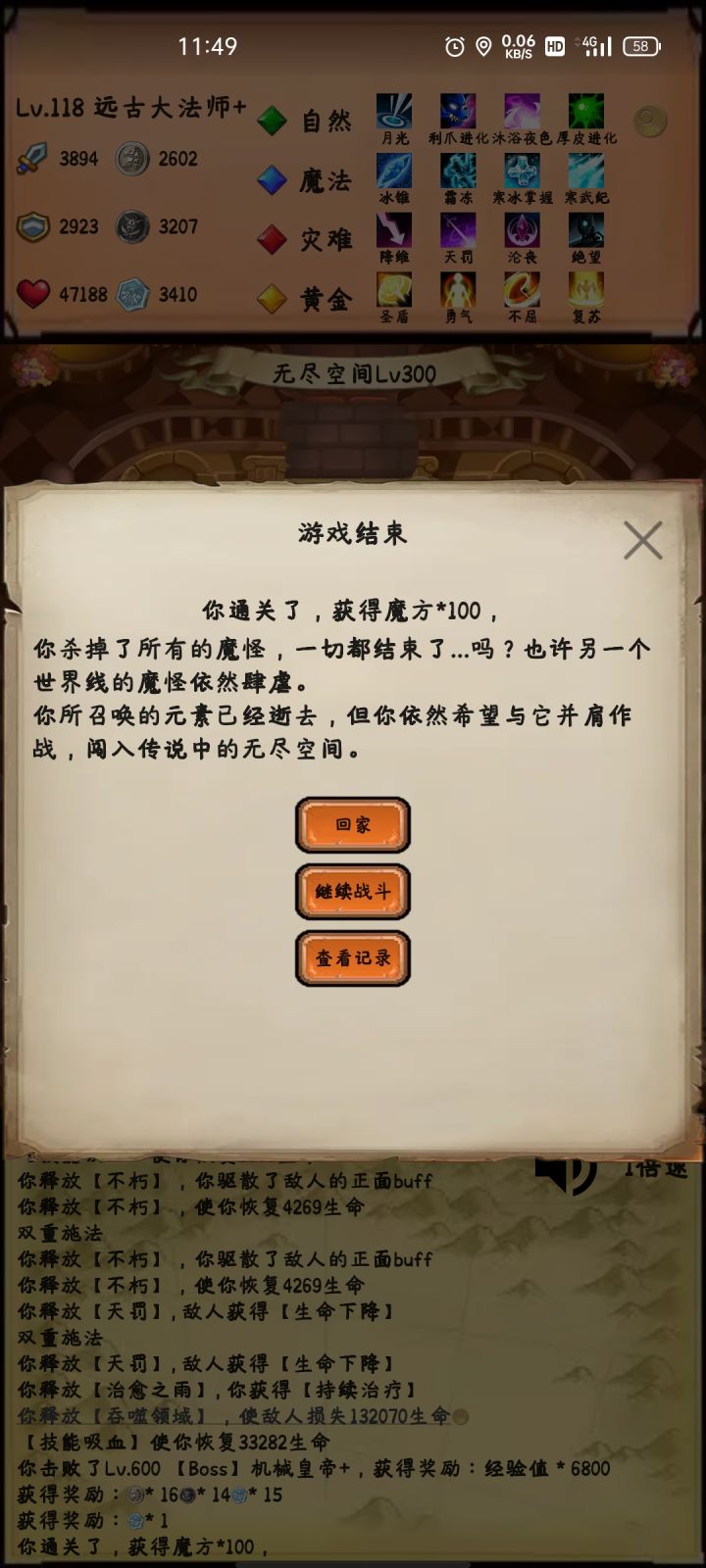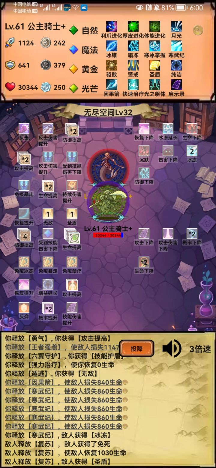 这套没有无敌,但很肉,爆发很高,打没有无敌的, 基本都是一套秒,打boos也就两回合,我的死因很简单,没看到对面有个新生,第一回合打出对面无敌,对面反打,没想到伤害这么高,四万血一下就没了,被反秒了……。如果可以,在无尽模式开局的时候刷一个复活的技能,直接反打一套,可惜这套阵容还没测出上限在哪,目前为止,还是觉得技能流更厉害些