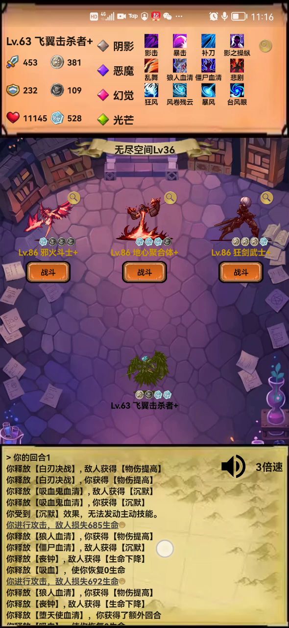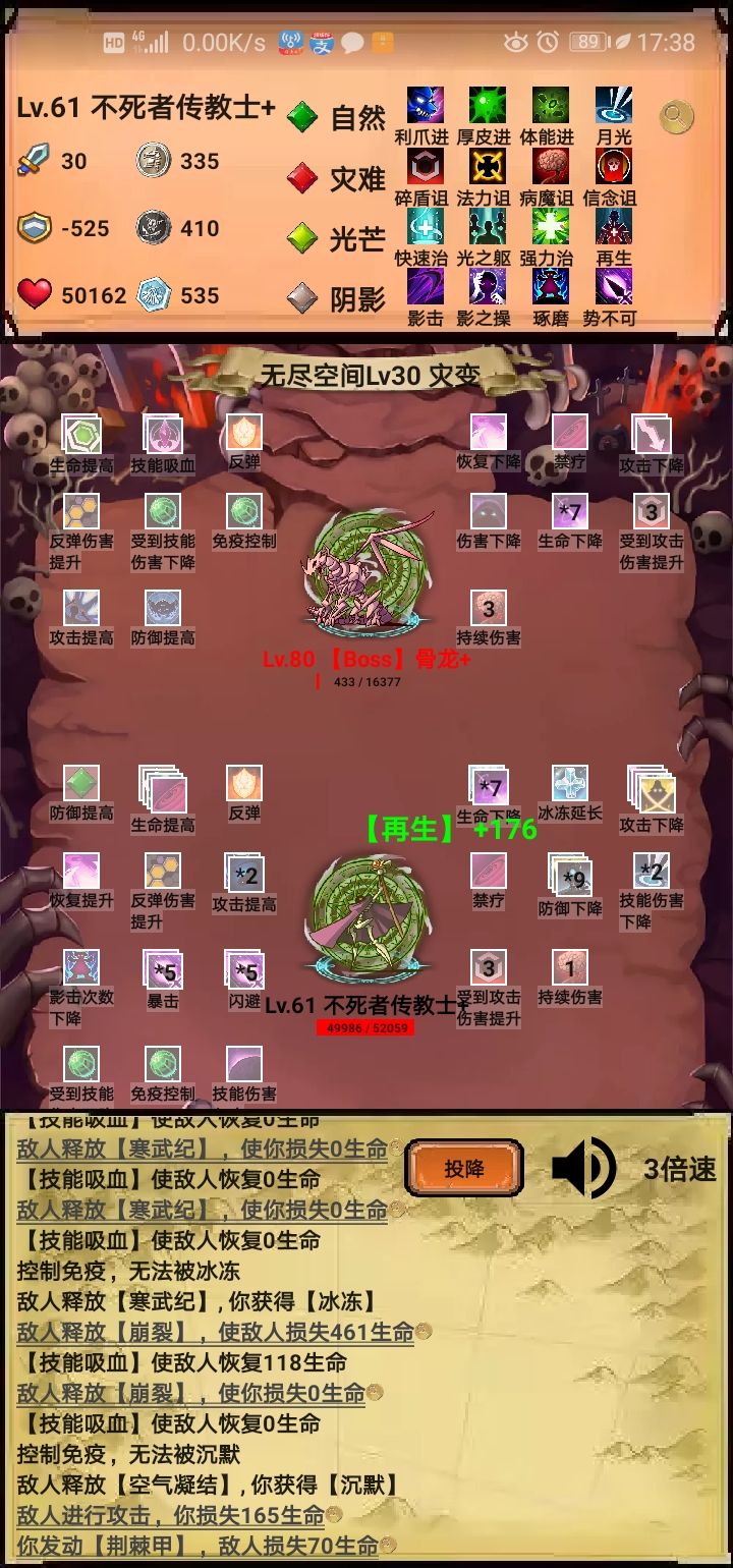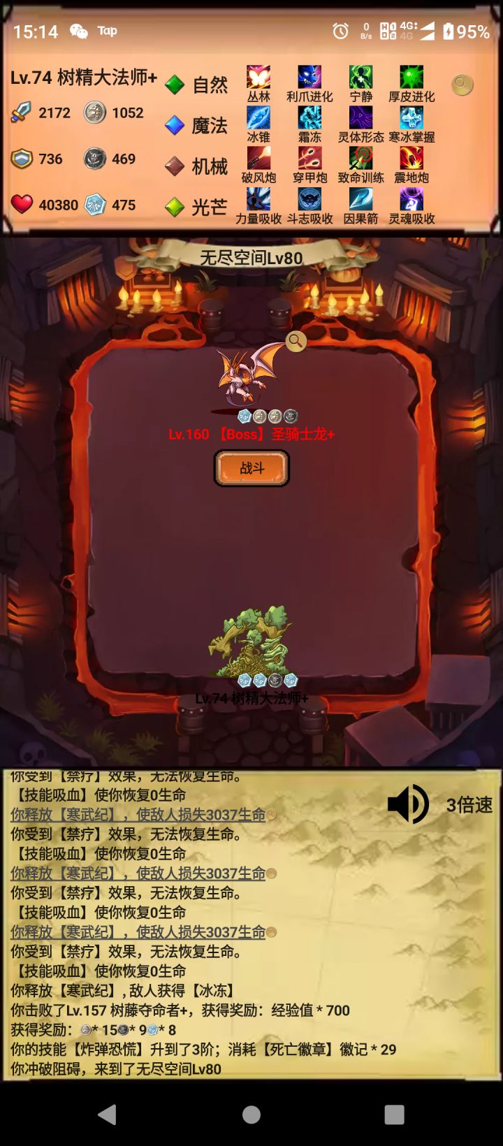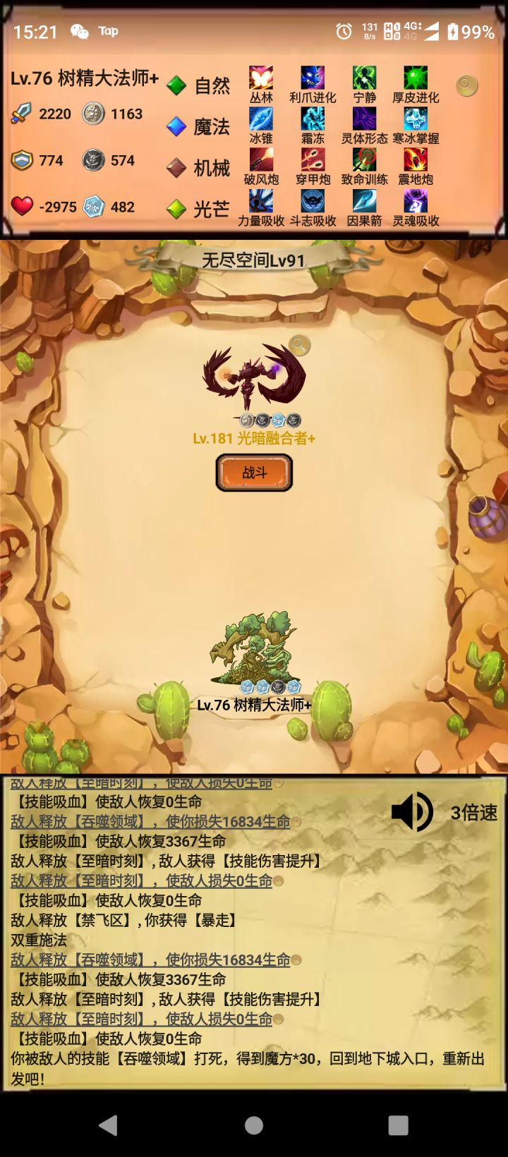 这套没有无敌,但很肉,爆发很高,打没有无敌的, 基本都是一套秒,打boos也就两回合,我的死因很简单,没看到对面有个新生,第一回合打出对面无敌,对面反打,没想到伤害这么高,四万血一下就没了,被反秒了……。如果可以,在无尽模式开局的时候刷一个复活的技能,直接反打一套,可惜这套阵容还没测出上限在哪,目前为止,还是觉得技能流更厉害些
