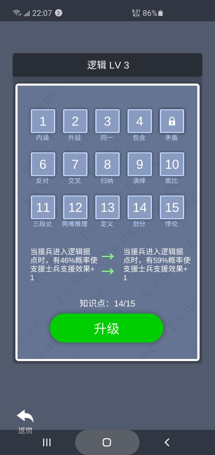 如图,全点了结果少一点升级点数。我是在点了第九个后直接点第11个三段论,然后升级,然后再点第10个,不知道是不是这个原因如图,无尽找不到返回的按钮,每次只好强退
