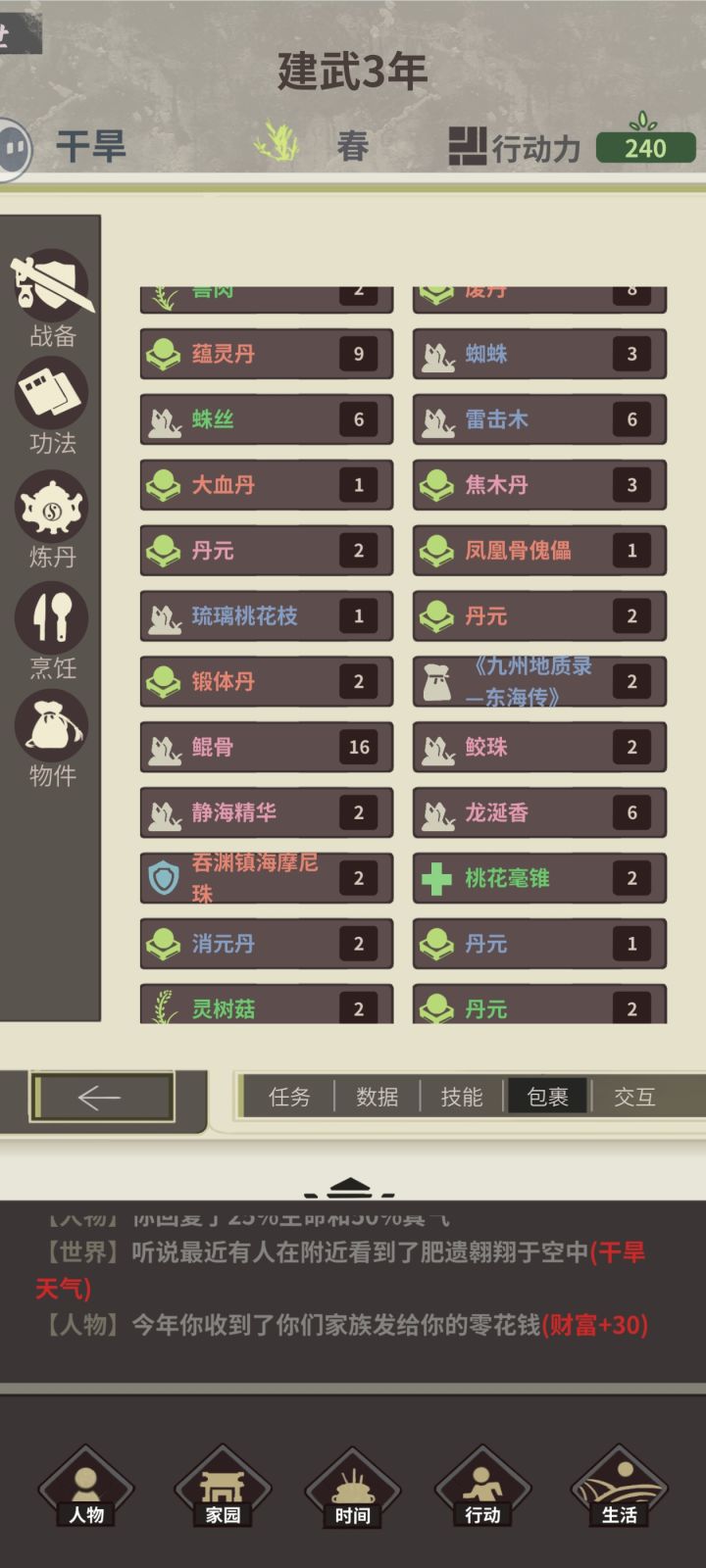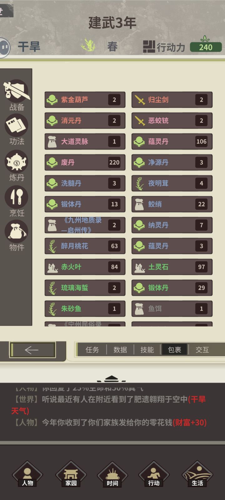 天赋:亿机,居无定所,五灵体特殊名称:折纸白鸢 第一年,先把九罗除聚宝坊外其余该点的点了,剩150行动力,去风啸荒原sl客栈,随便逛逛sl店小二事件,智力夺取术,凤凰骨,剩下45行动力sl临枫土(后面统称蓝土,刷多的),还需要个客栈(普通就行),炼丹1次(普通蕴灵丹,用两蓝土练),寄拍仙品材料(店小二) 第二年,sl到天鸾城,普通拍卖两次sl出归尘剑,血魔之力,剑一令,飞雷功法(两个或更多)