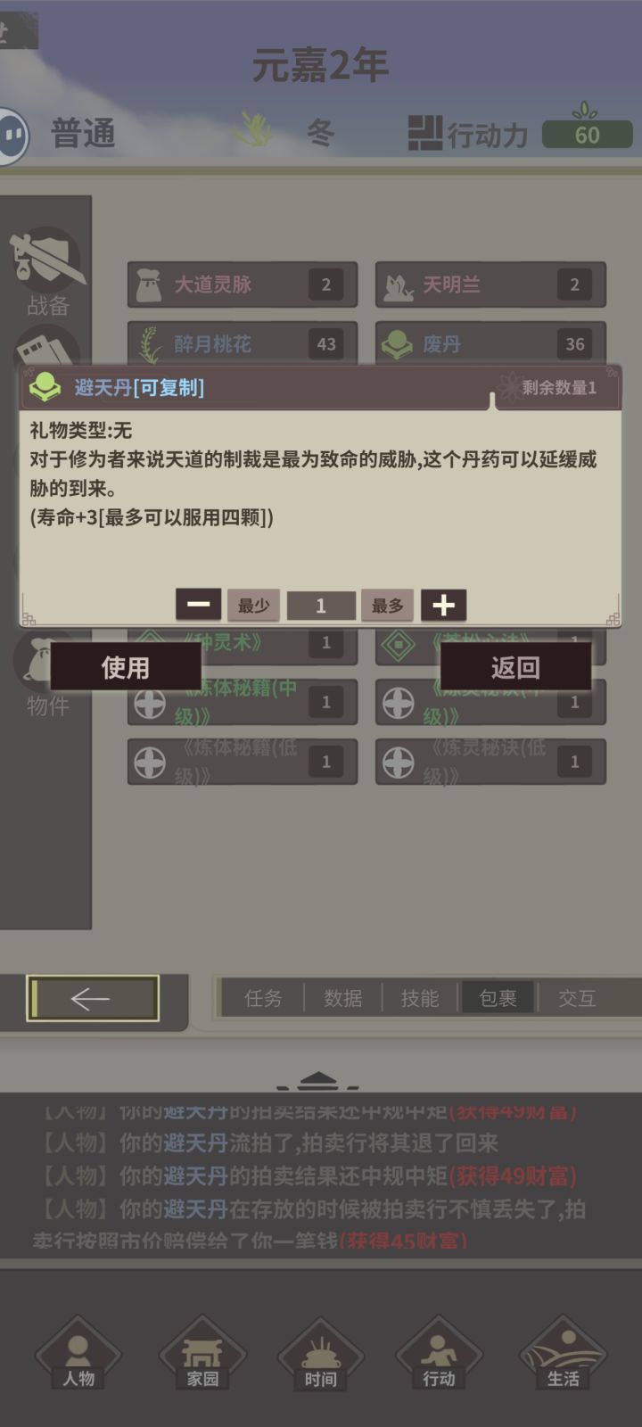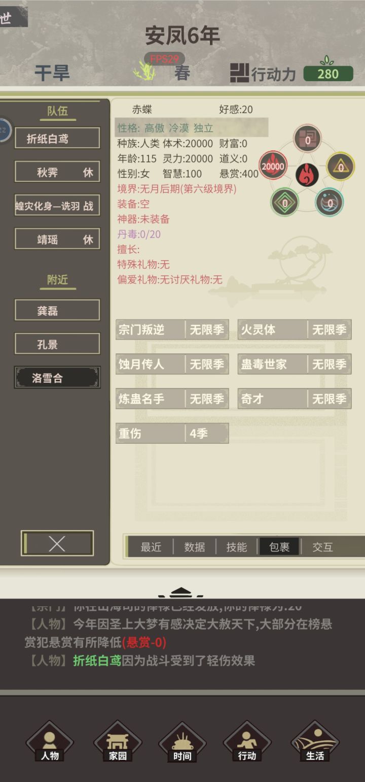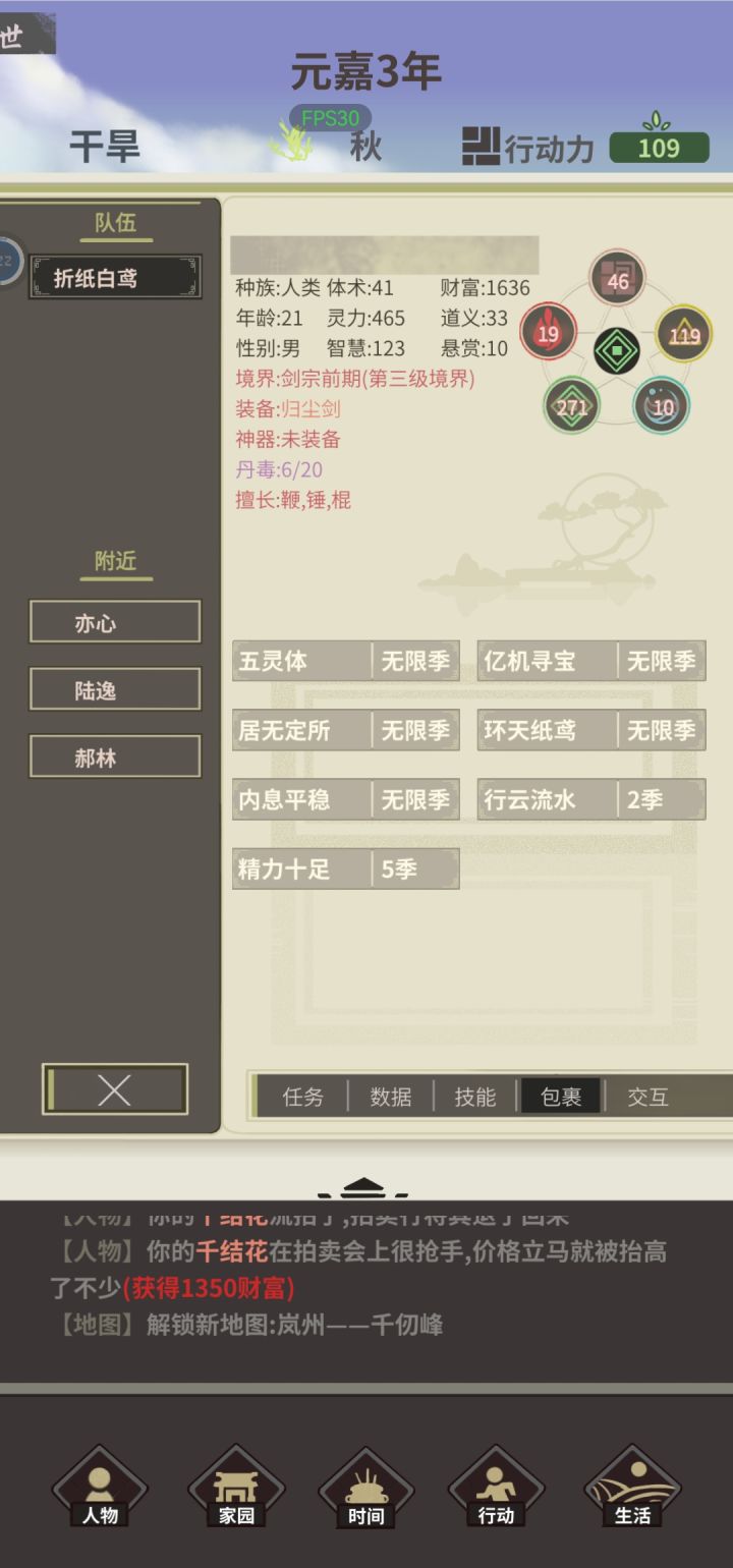 天赋:亿机,蚀月传人,体虚,炼药天才名称:折纸白鸢 第1年,木属性。去九罗开风啸荒原,去风啸sl客栈(此时正好190行动力)(精),去九罗把该点的点了(除了聚宝),练一次蕴灵丹(把丹药全吃),去梦泽解锁钓鱼,sl事件,拿气运,智力夺取术,店小二 第2年,sl事件,闻道和探讨拿了,去捕毒(中途拍卖一个仙品材料,1350),捕毒,去迷失外围sl客栈(精),年末寄拍仙品材料(两个仙品材料分开拍