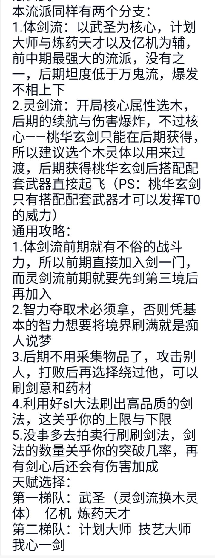 开局必备天赋武圣,亿机寻宝,剩下两个随意,推荐加个炼药天才,可以练仙品丹药来自己吃。。一定要点炼丹术开局先挖个三年攒初始资金,还可以炼炼丹药加属性或者卖钱.核心思路就是利用钱财加剑意的那个剑心,利用亿机寻宝天赋,来云州买大力金刚指贩卖赚钱。这时候要用连点器来节省手指。剩下的就是加入剑一门,随便逛逛触发50剑意事件或者自己打,总之尽快弄到那个剑心,之后就是一年猛扣体力猛加剑意,我刷了15000