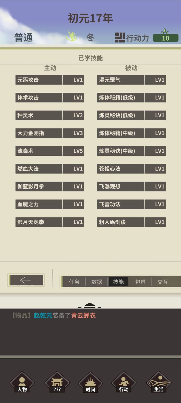 这把属性很垃圾,体质200,灵力1500,没有特殊技能,实战只用流毒术,大力金刚指,血魔之力三个技能,弱鸡散修堵上一切的九州夺魁。(本来还有一把红色拳法,奈何我比武之前没体力学不了拳法,只能用大力金刚指这破玩意,不然几乎不需要sl)具体的方法如下:必要:流毒术,血魔之力,归尘剑,健身狂具体打法: 我出门选的木,5炼丹术15智力,后面有个事件把体力转化成雷,平时采集草药遇到的所有灵石全部吃。出