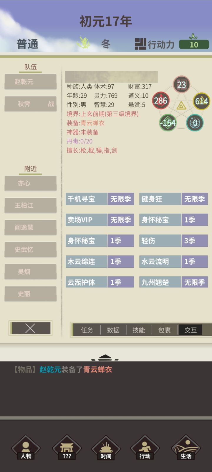 把自己玩的时候遇到的难题列一下,给之后的玩家作参考:智力夺取术,随便逛逛遇到一个人,似乎是叫傻龙,然后他会直接问你要什么,遇到就明白了,没有前置选项武圣印记在丛林深处,一开始只有丛林外围,开启丛林深处要去山海接任务提升伙伴的额外好感需要加好感的丹药,好感20可以结婚,如果只是傻傻等剧情的话好感上上不到20的战斗力不够不要和老婆逛街,遇到凡正阳逃不掉的,尽量先发育,这剧情没有时间限制四象死了以后的天罚是3500属性过关,4500是武圣之死