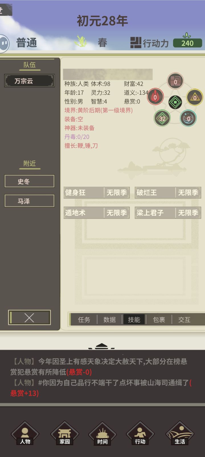 被忽视的绝活天赋,人生向导这个天赋非常强力,结合智者(每年加一智力)或者必定偶遇的功法(选择智力夺取术),那么这个天赋就可以一直加道义,不管被通缉多少每年都有很大概率直接减很多下来,这样来的大部分追捕的人都很菜,直接送材料和经验来的,就可以随意杀人夺宝,几乎不用担心后果。