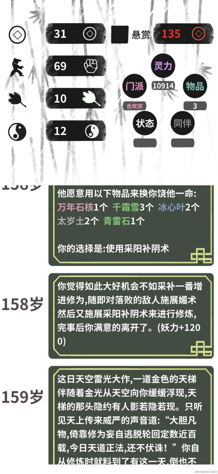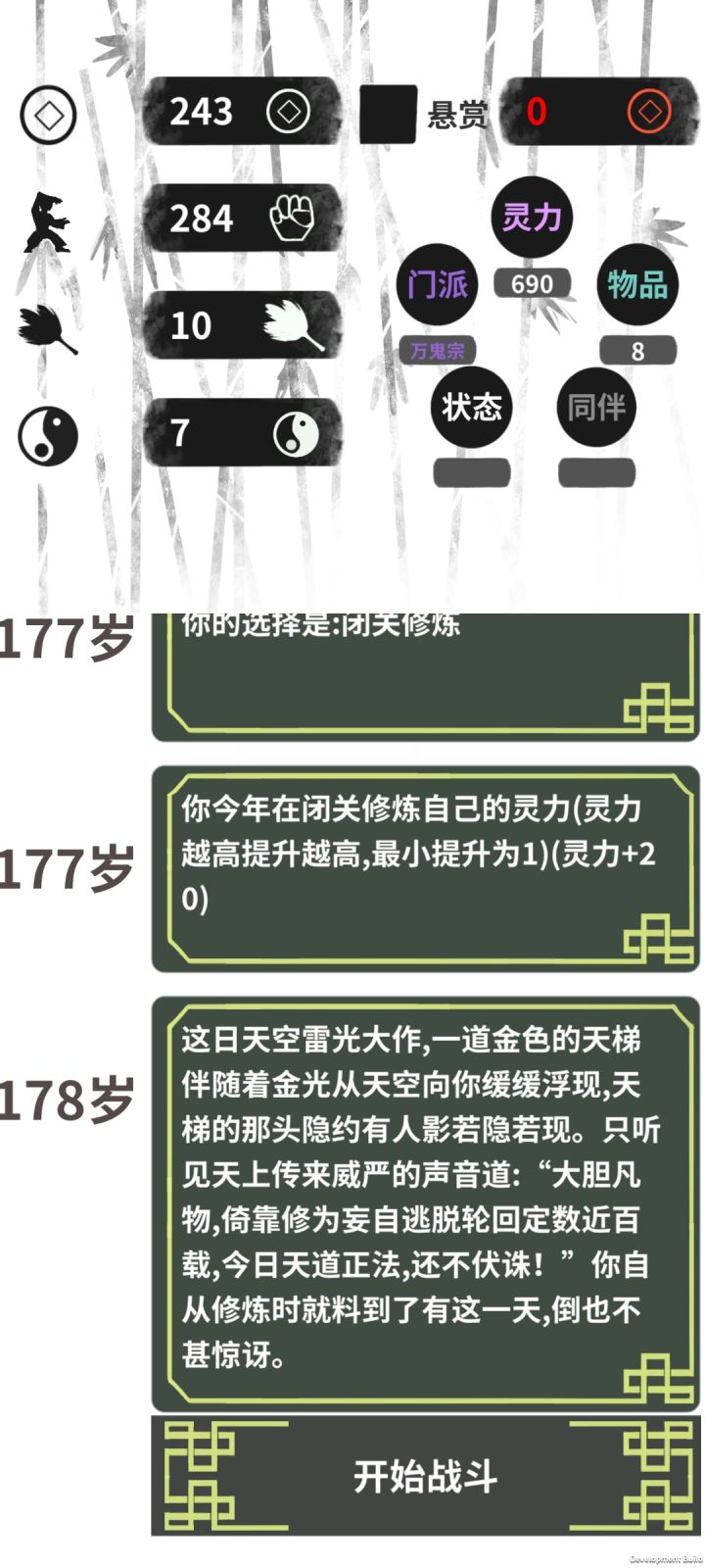 鬼宗玩法建议炼药开局然后前面就是正常了18岁前,炼药学了剩下就是读书读书,多读书没错18到40采药41炼药(火药留着 ,去铁匠打造成炸弹)然后去招鬼,干苦力,招鬼,干苦力,等天劫来了,就火药炸死他20个就可以死了