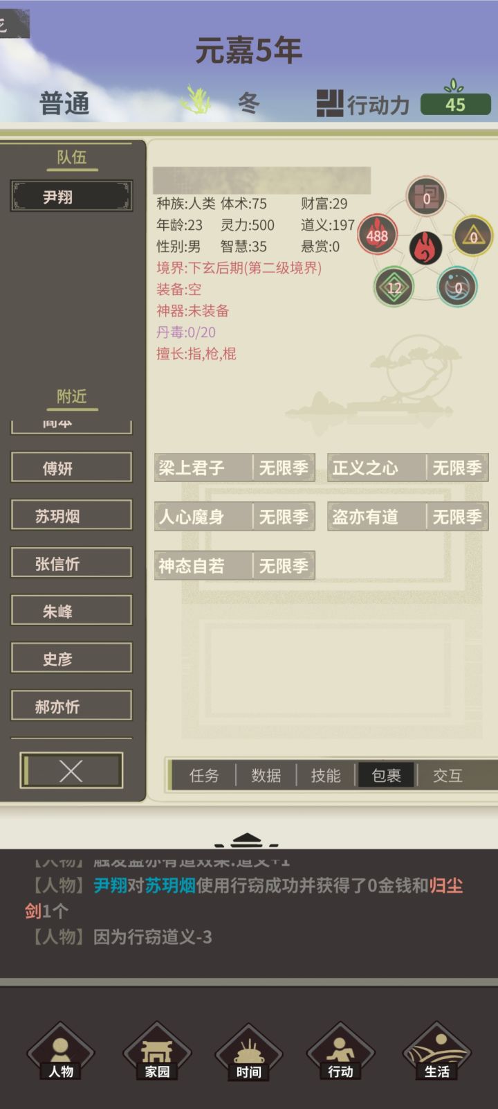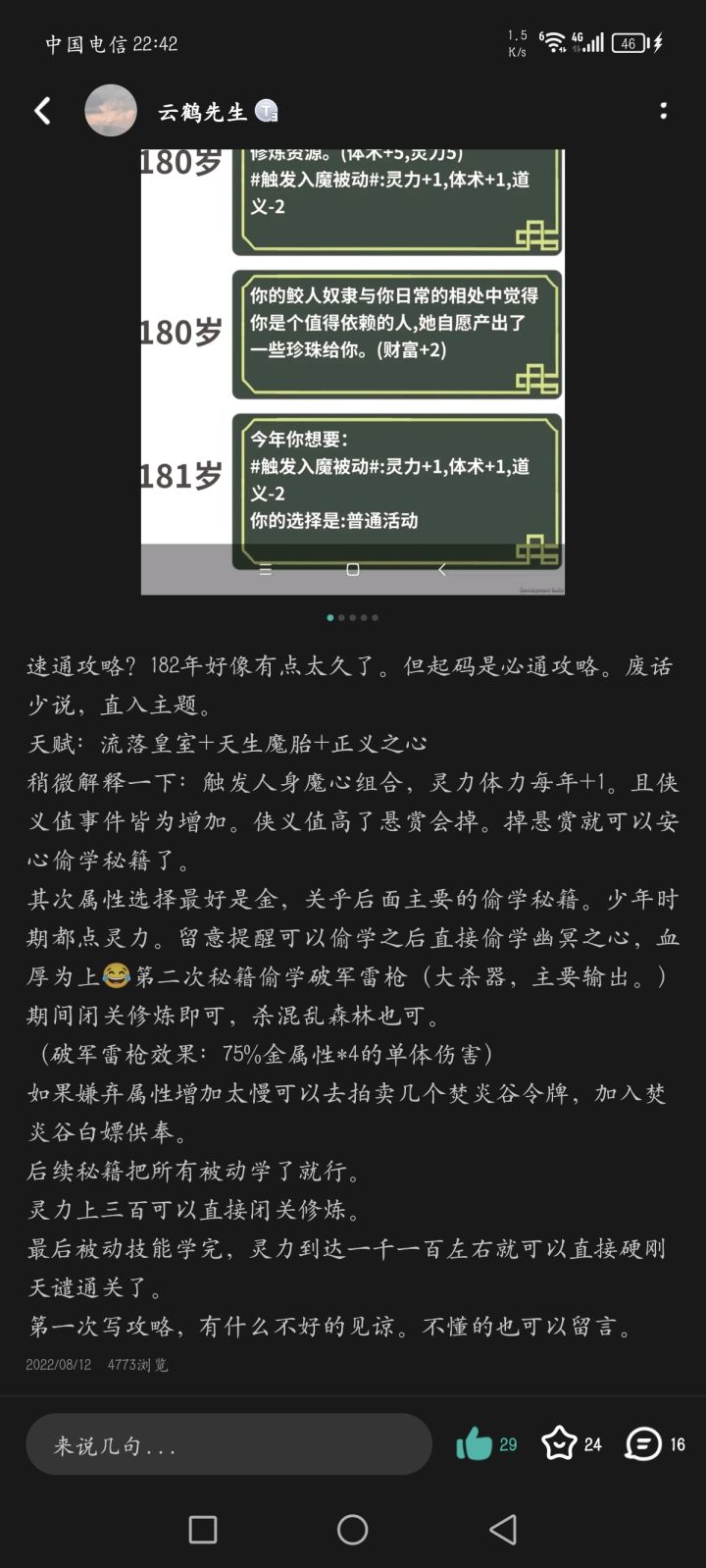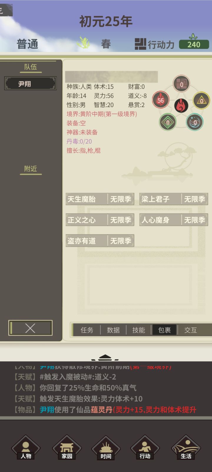 天赋推荐: 亿机寻宝 计划大师 铁匠家庭 天眼 核心思路:血色天地+破军枪+附骨妖火 玩法:开局把所有任务都开了,然后采药80两次出售把鲛人买了保存.. 开拍卖如果有紫金葫芦就重开 移动到炽热之废墟通过探索升到2镜顿多余的20行动力可以拿来炼丹或者转一转 然后去梦泽把螃蟹打了 加入焚古再移动到炽热之墟探索会有客栈获得精力十足的buff 有了buff就开始钓鱼(直到钓到锦鲤+25福运和朱砂鱼开图道具)ps:钓不到也没关系等有buff在钓也是一样 随机转转花一年时间凑齐血色天地 凤凰骨 人偶事件 盒子事件 通过盒子事件可以练大血丹(冰心叶2千竹叶2血蛊) 吃一个血蛊在吃大血丹建议多保存因为可能炼丹失败 探索一年最多加400以上灵力 (聚灵阵打坐) 升到4镜学圣火诀(升到3级)去东海采集水灵石1次合成破军枪顺便把鲲打了 通过采集鲲 把装备都卖了 然后接着去炽热之虚刷灵力 接下来就可以打蝗灾了 注意:有火灵石就吃 尽量吃红色的丹药 龙脉诅咒剩余6季就开始打