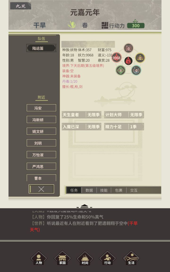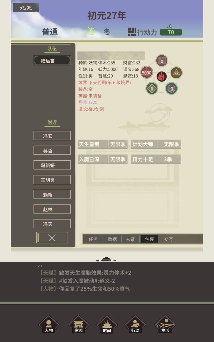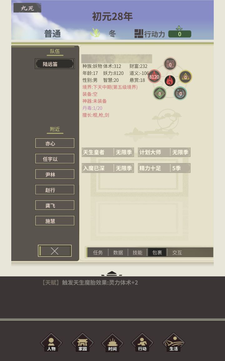 人偶不能加入宗门,但是属性是三个种族中最好的,非常适合我这个打法之前妖族的18岁10000灵,虽然看着挺帅,但是不中用。(见图)推荐天赋:计划大师(核心),【灵开智悟,健身狂,火灵体】(这三个纯粹为了数值更好看)准备工作:开地图+开拍卖场,sl出堕入魔胎,和混元罡气(任意时间),血海不死(任意时间)注意事项:1、4-5阶的突破材料可以拍卖场买,5-6阶的突破材料可以抢,或者sl转转里的一