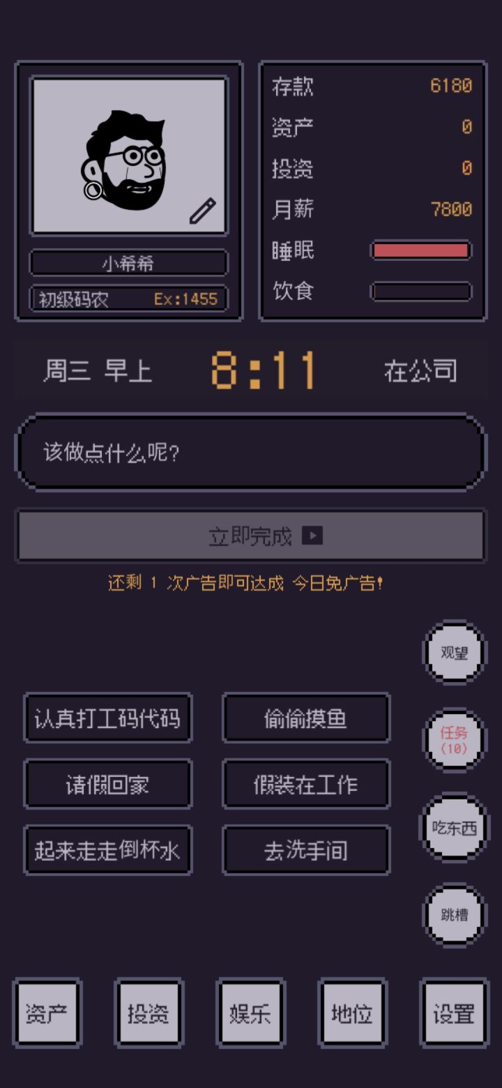 睡眠和饥饿根本没用,最多也就减少39%的效率,人根本不会死亡,于是游戏角色化身机器人,每天不用吃喝拉撒,上班就认真码代码一直码到第二天凌晨强制下班,通勤回家后一直学习到早上8点多,继续通勤到公司认真吗代码,周而复始到周末连续两天三夜学习,再到周一早上开始新的一周循环,这么玩不吃不喝省下一大笔吃饭开支,经验也涨得飞快