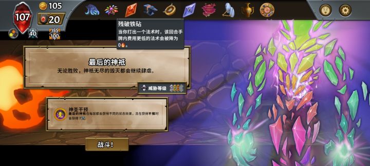 因本人冥卫多用于副氏族进行游玩,所以从前几天打的一个25契约专家挑战用来参加活动这一局神器总体强度并不高,且法术卡组和强化石也并不欧,因此我此局的思路相信还是能给一些游友提供参考的,尤其是用在这一专家挑战下。首先,初始卡组建议包含献祭代币,其他卡组随意,可包含保存或地穴建造器或泰坦之牙之类的,也可局内再拿。局内单位如遇到鳗鱼或影裔造物(煤球),优先拿。后期鳗鱼需要补够一定血量