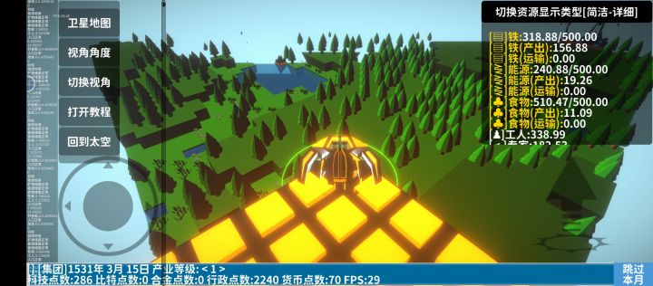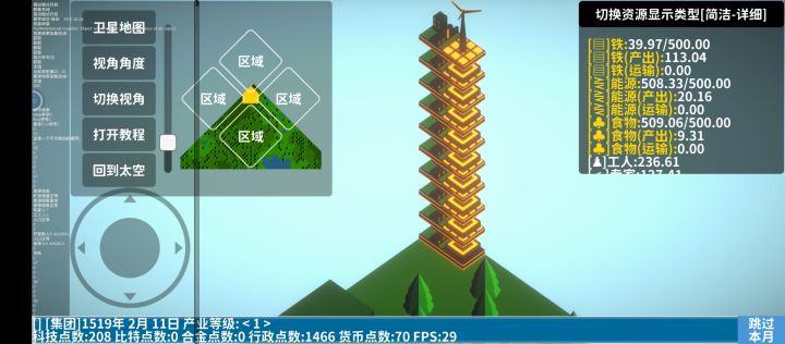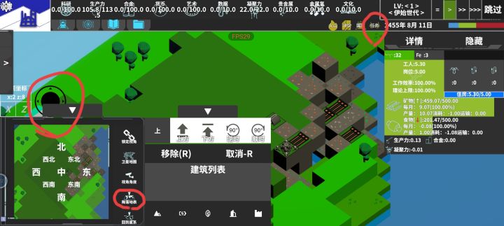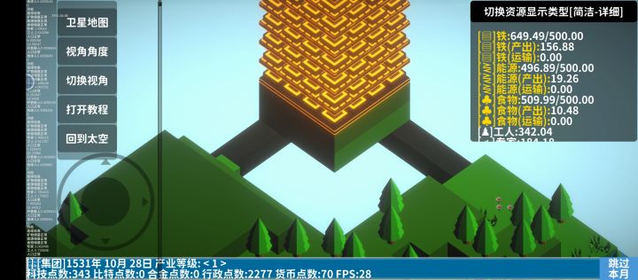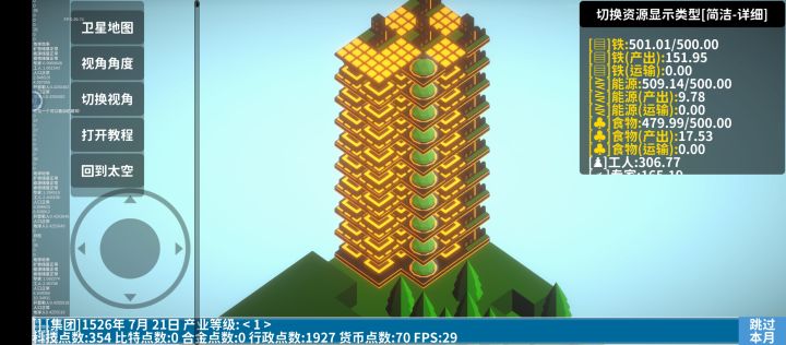 开局先造简易房屋和农田,接着造深邃钻井挖矿,造风电发电。然后不断增加人口和铺建筑提产能滚雪球。有一定能源和铁产量基数后造一些实验室,科技点可以升产能和节能。注意,风电升节能无用,火箭发射器等升产能无用。前期不要管比特,因为需要比特合金等高级资源的建筑,效率都非常低,同样不需要管产业等级,因为产业等级只跟解锁地图有关,升几级什么也不能解锁科技点优先点铁矿产量,其次点风电产量,等铁矿产量有几百