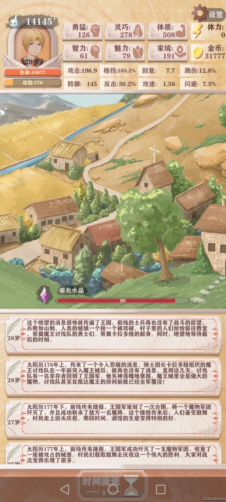 首先,这是个战斗游戏,勇猛之类的属性不重要,重要的装备要好,其次赚钱买装备第二重要,最后,如果打不过去别怕轮回重来,在主角光环里面把体力加满再加别的属性,轮回十次可以完成成就。进入游戏1岁,随机事件,家里有老鼠,选抢走奶瓶+勇猛。全部选择爬来爬去,增加体质。5岁之前不要和父母互动,收益太小。3岁,可以读书了,全部选择读书,你会随机读到穿越者的故事,看完全本书会+10智力,建议优先刷这