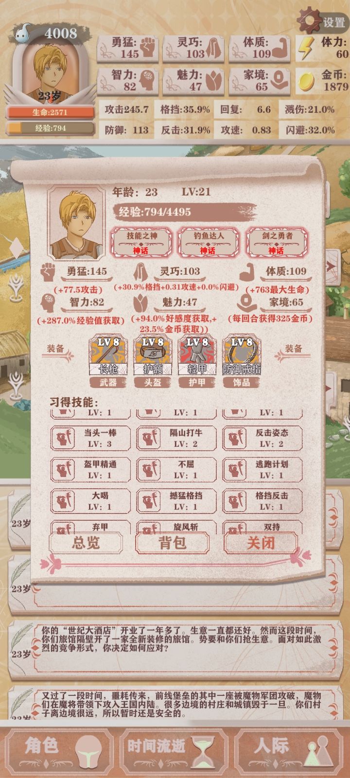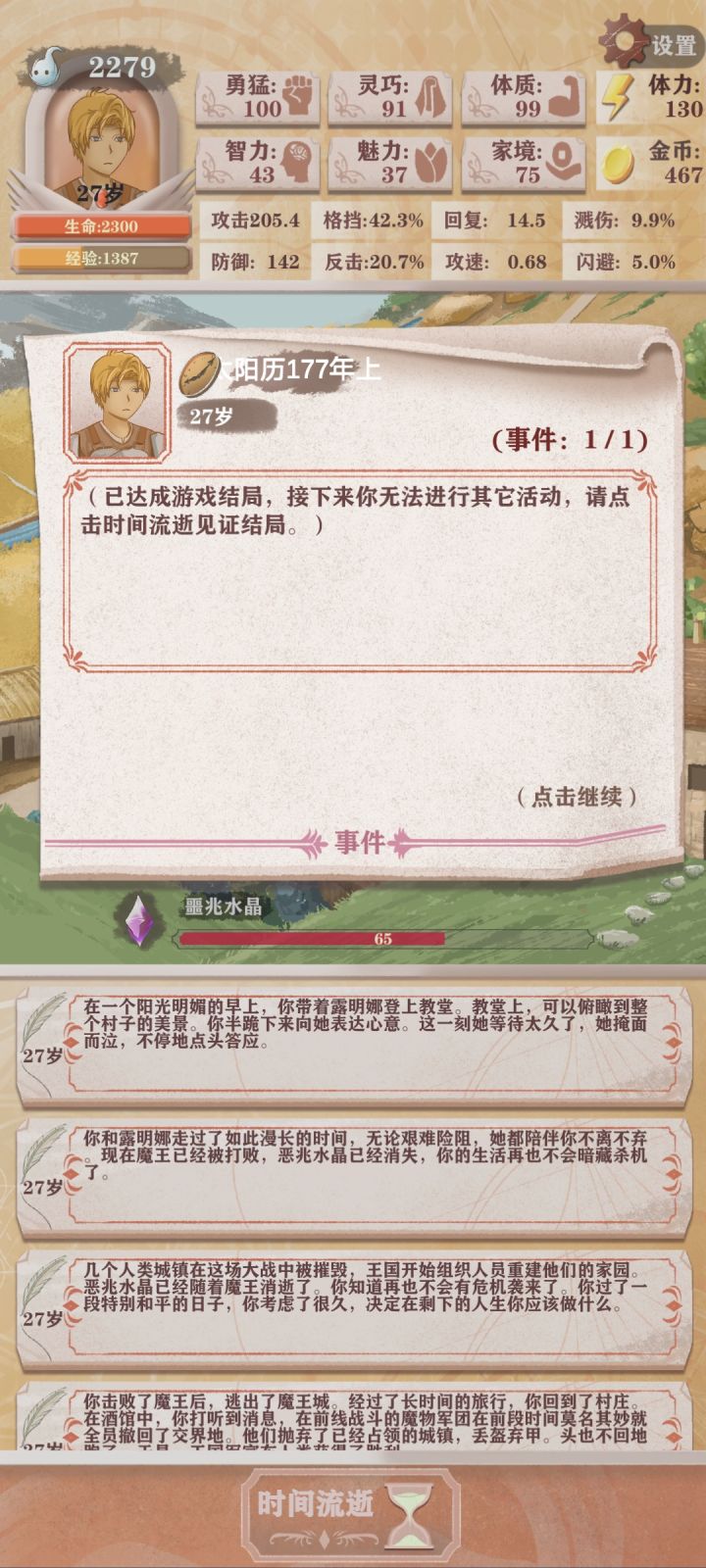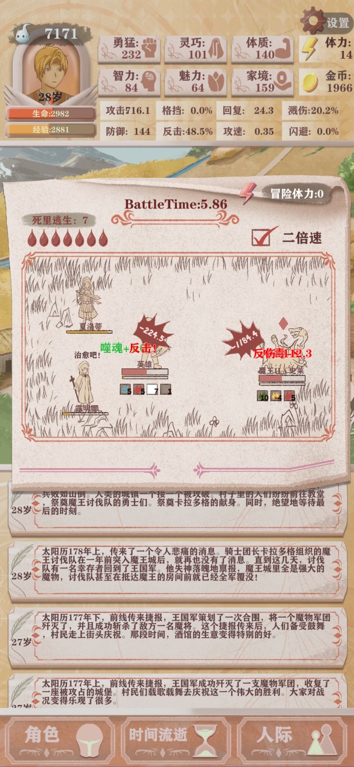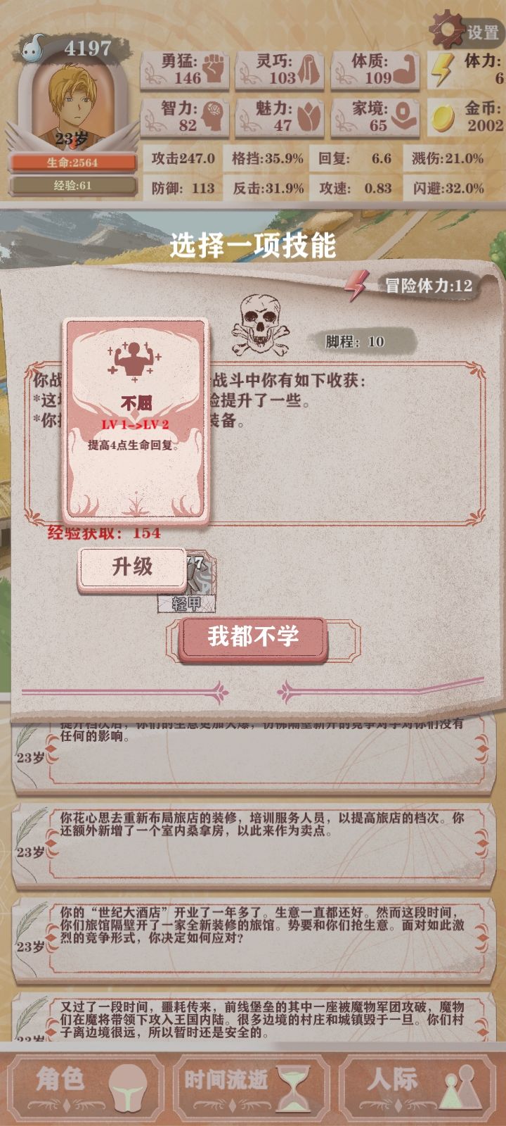 两天疯狂肝了13世终于打爆boss了这游戏太上头了给萌新的建议记得10岁以后要去酒馆吃东西加体力这样才好发育前期尽量多搞点魅力,唱歌和参加比赛都可以加魅力,后期酒馆和教歌还有钓鱼赚钱其他没必要。打boss建议要3条命各个数值最少90平常得到的钱尽量去加点。战斗推荐反伤回血流具体技能加点去看别的大佬怎么加点我也不是很清楚😂😂