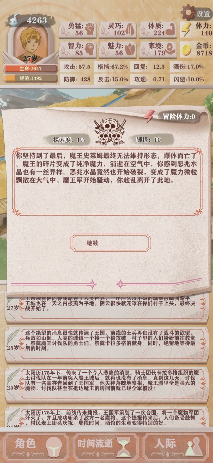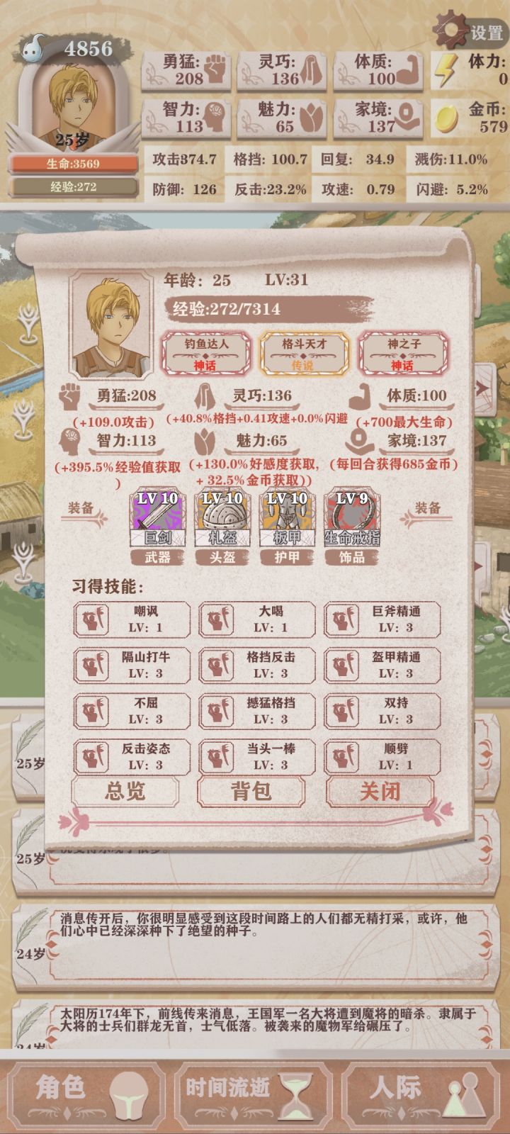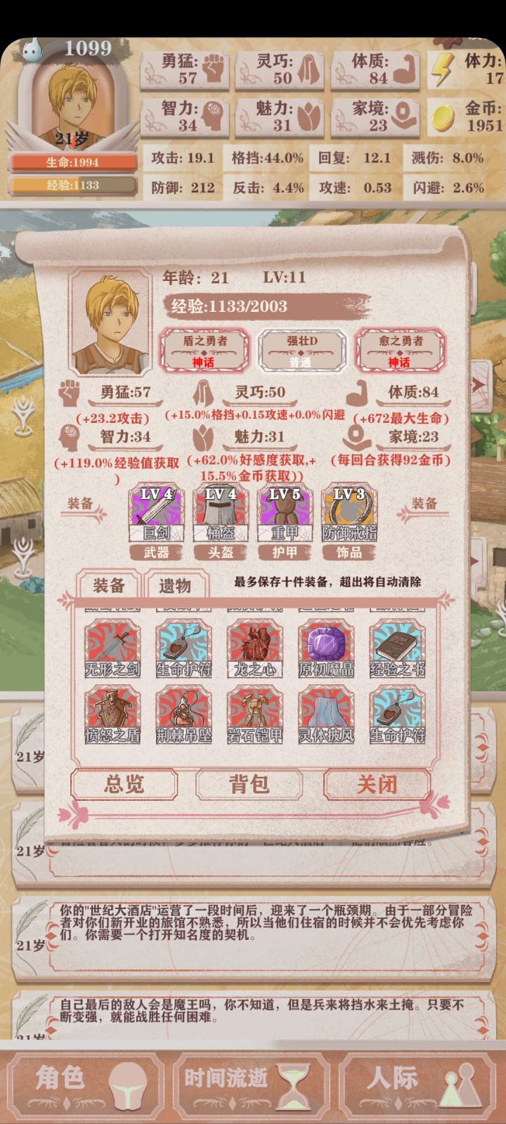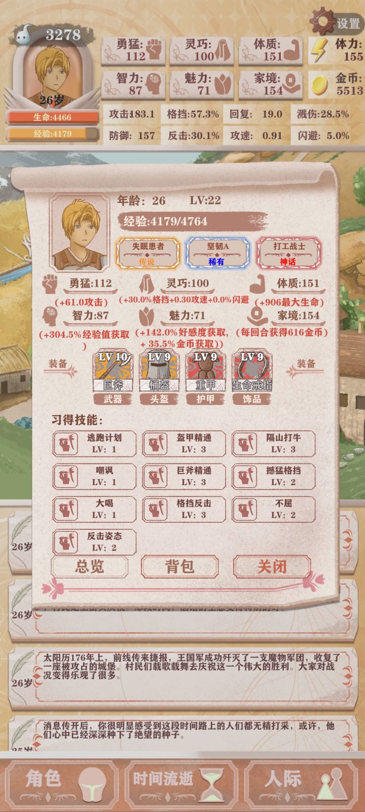 两天疯狂肝了13世终于打爆boss了这游戏太上头了给萌新的建议记得10岁以后要去酒馆吃东西加体力这样才好发育前期尽量多搞点魅力,唱歌和参加比赛都可以加魅力,后期酒馆和教歌还有钓鱼赚钱其他没必要。打boss建议要3条命各个数值最少90平常得到的钱尽量去加点。战斗推荐反伤回血流具体技能加点去看别的大佬怎么加点我也不是很清楚😂😂