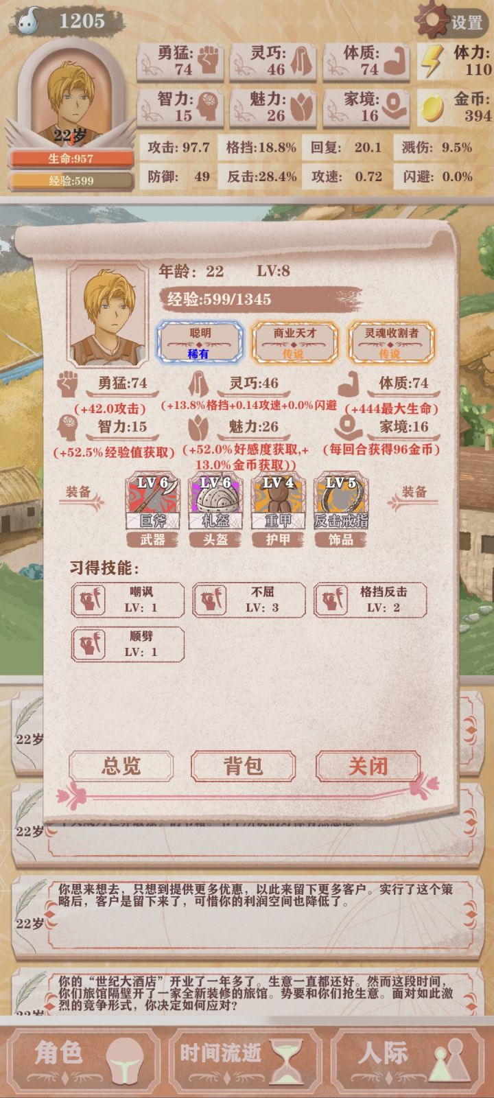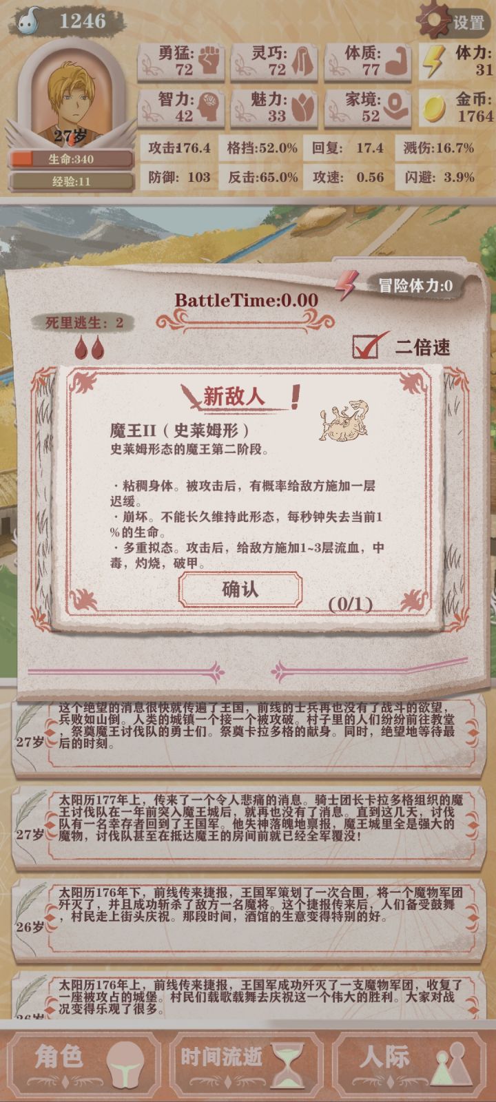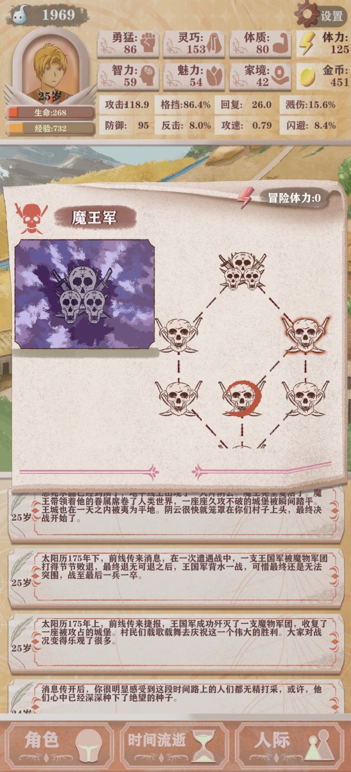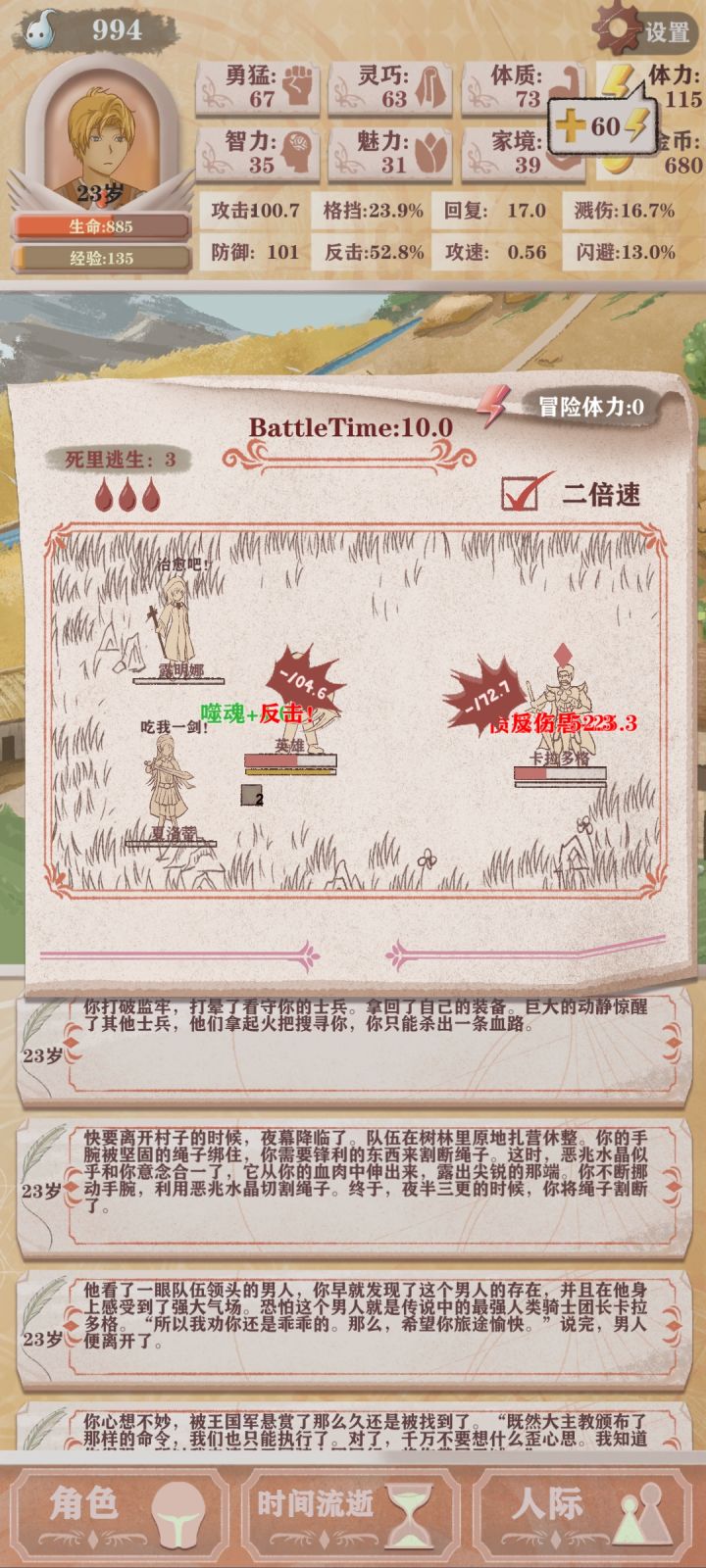 第四次轮回,只能勉强看到boss太难了(点的天赋是体力➕10,成长期的勇猛增长,还有一个资本家加钱)发现还是需要战斗天赋才行我要是有个格斗家估计就能过了