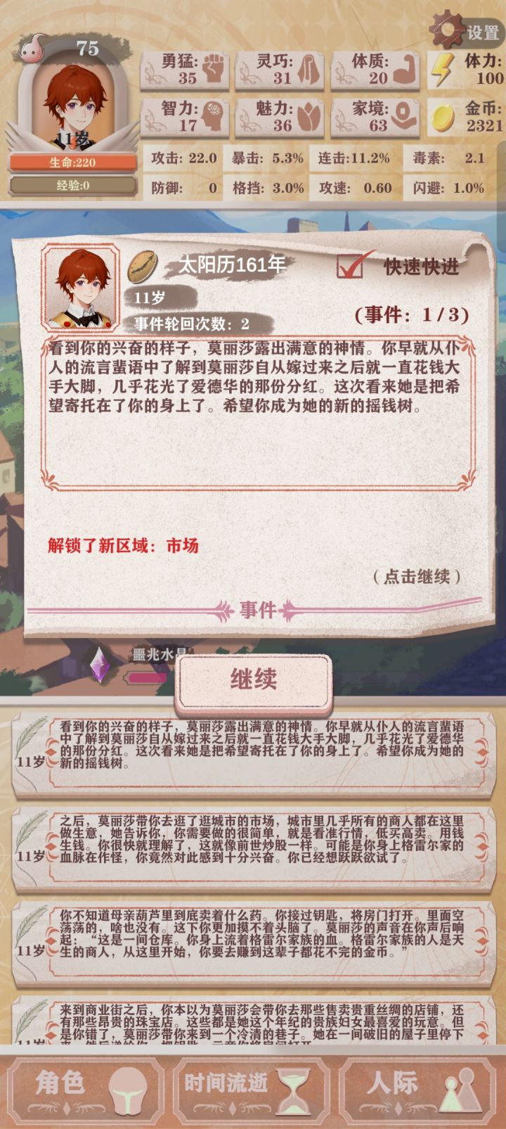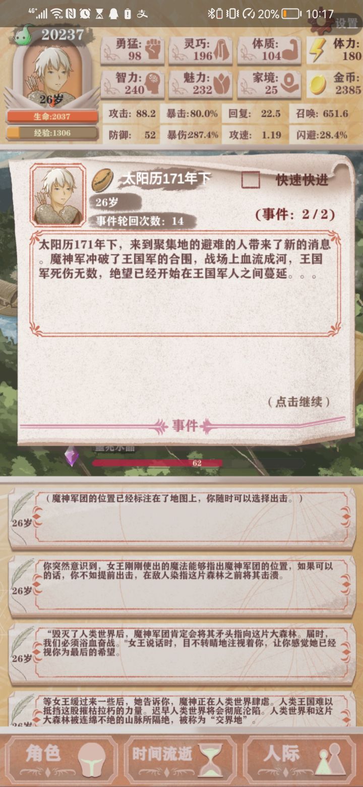 首先sl是指在你回合不满意的时候清除游戏后台可以重新开始这一回合下一岁的事件没有结束时 同样可以sl回到上一回合例如这个事件没结束的时候 我就能回到26岁上半年 重新开始26岁上半1岁事件:4点智力 需要连续三次梦到村庄 新手不用刷这个事件3岁事件:去父亲房间探索2智力 去树上玩3勇猛 球状闪电或者给父亲帮忙事件 或者直接加1智力 1魅力给父亲帮忙是20体力两点灵巧球状闪电是加3体质