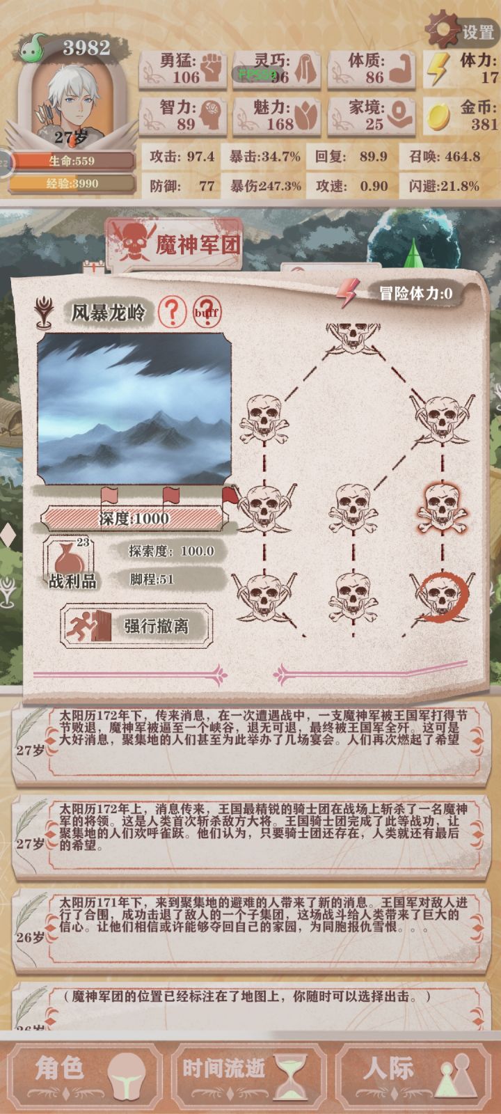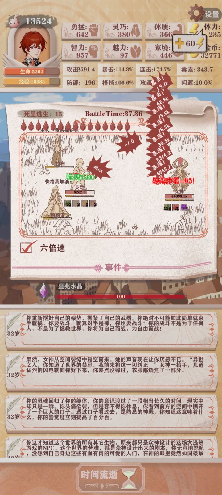 第一次打女神,16条命,打了4次没打过,sl了4次,第五次只剩最后一次死里逃生的时候过了。都怪毒骰子一次毒我大几百。搞得我死了又死。还有就是没有防御戒指。虽然没有防御戒指,我也站住了。就是需要等公主给我叠满10层防御buff。叠好我就站住了。毒骰子是败笔。把自己毒死了。看了好多好多攻略,跑商攻略,天赋攻略,营销攻略。新版本松露没有智力加成,经营变困难了。初步了解了女神的难打之处。我把普通关,残1