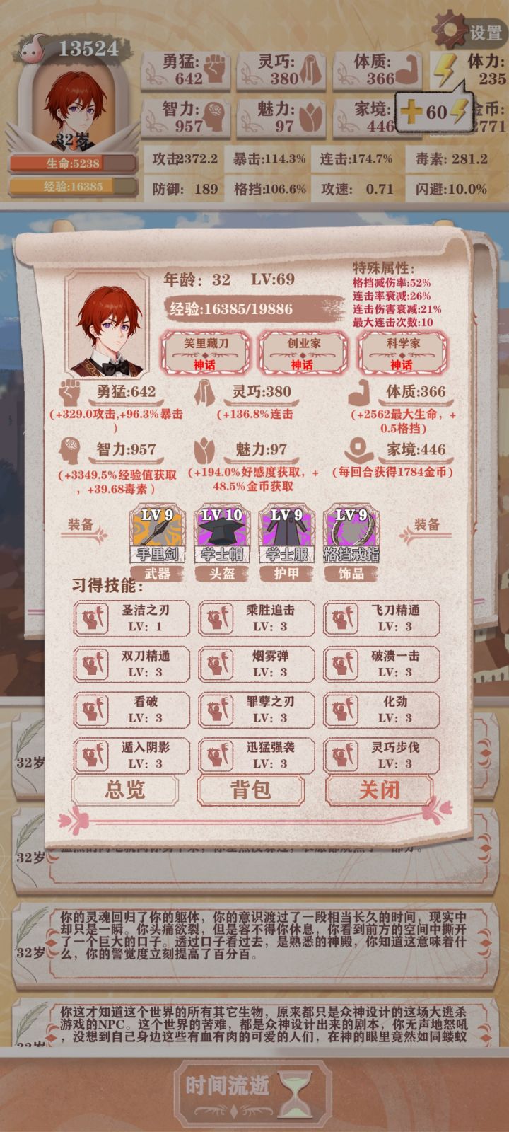 首先,这是个战斗游戏,勇猛之类的属性不重要,重要的装备要好,其次赚钱买装备第二重要,最后,如果打不过去别怕轮回重来,在主角光环里面把体力加满再加别的属性,轮回十次可以完成成就。进入游戏1岁,随机事件,家里有老鼠,选抢走奶瓶+勇猛。全部选择爬来爬去,增加体质。5岁之前不要和父母互动,收益太小。3岁,可以读书了,全部选择读书,你会随机读到穿越者的故事,看完全本书会+10智力,建议优先刷这