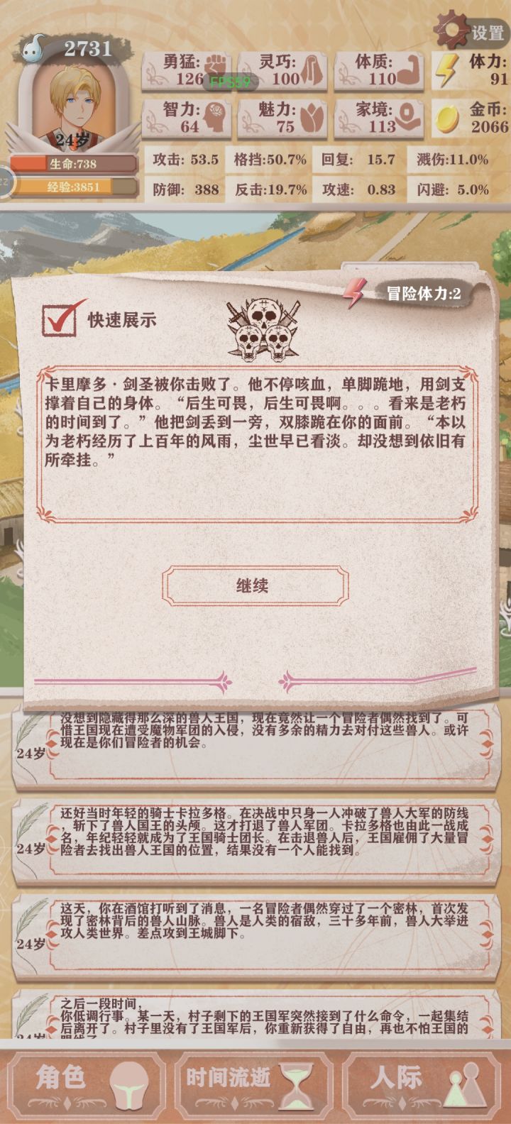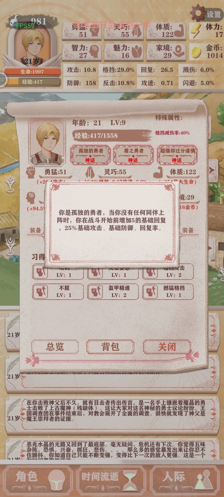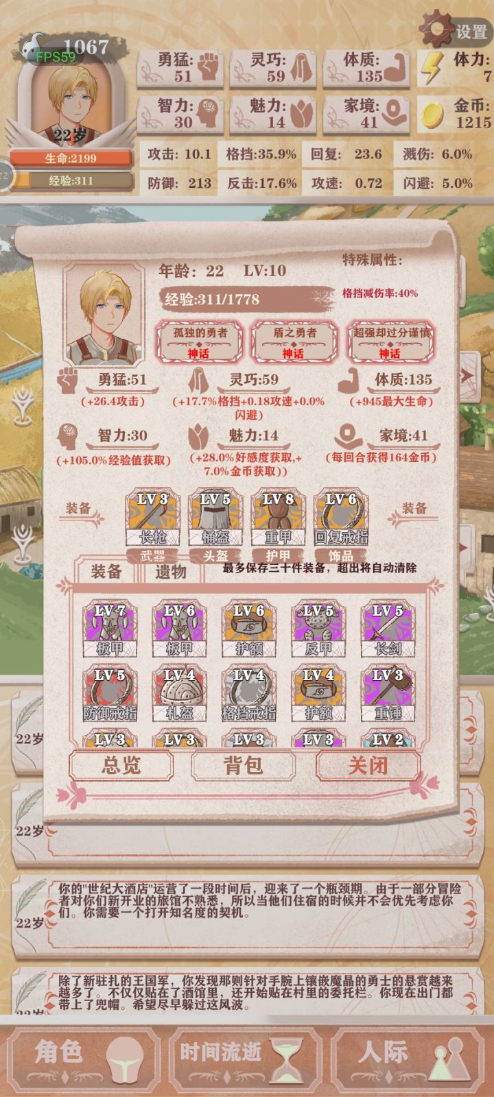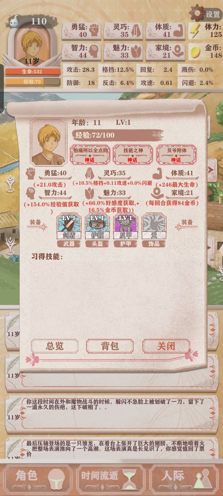 开局天赋:灵魂收割者,愈之勇者,怕痛 必备遗物: 守护吊坠(父亲好感15岁前250), 液态铠甲, 黄金甲(要赚钱,具体操作写后面), 聚魂铃铛(后期有就行), 必不能有的东西:一切加反击溅射的技能、遗物跟装备(装备前期无所谓,刷的时候不能有)。技能不要选防守反击!!弃甲别选!! 游戏选择:开始只用玩玩具,中后期血量只需要控制在1500左右就好。 然后读书读完故事。如果遇到老鼠事件,先放过,第二年告诉父母+1魅力(魅力就是💰!!)。 10岁前每次先去教堂看眼,看看有没有唱诗班,有就留体力,关程序重开(sl),觉得麻烦可以不用做。 有住宅区了留35体力去找小孩玩,+魅力(魅力就是💰!!)。 有体力轮流点勇猛和灵巧,觉得自己输出够了就都点灵巧。循环基本锻炼灵巧,买糖(打完卡力古多不买),酒馆,钓鱼,唱诗班,冒险。钓鱼钓到溅射的请sl,碰到卖田就买(打完教父不买)。 打完哥布林还留着全要的可以全要(魅力就是💰!!) ,打完牛头人一个都不要,打完地龙拿防御,打完教父拿噬魂。不用打剑圣,图都不用进,必死。 打完卡力古多可以试着打精灵了,重点来了!!!如果你的防御回血量不太够,杀一只精灵!!!杀一只精灵!!!杀一只精灵!!!