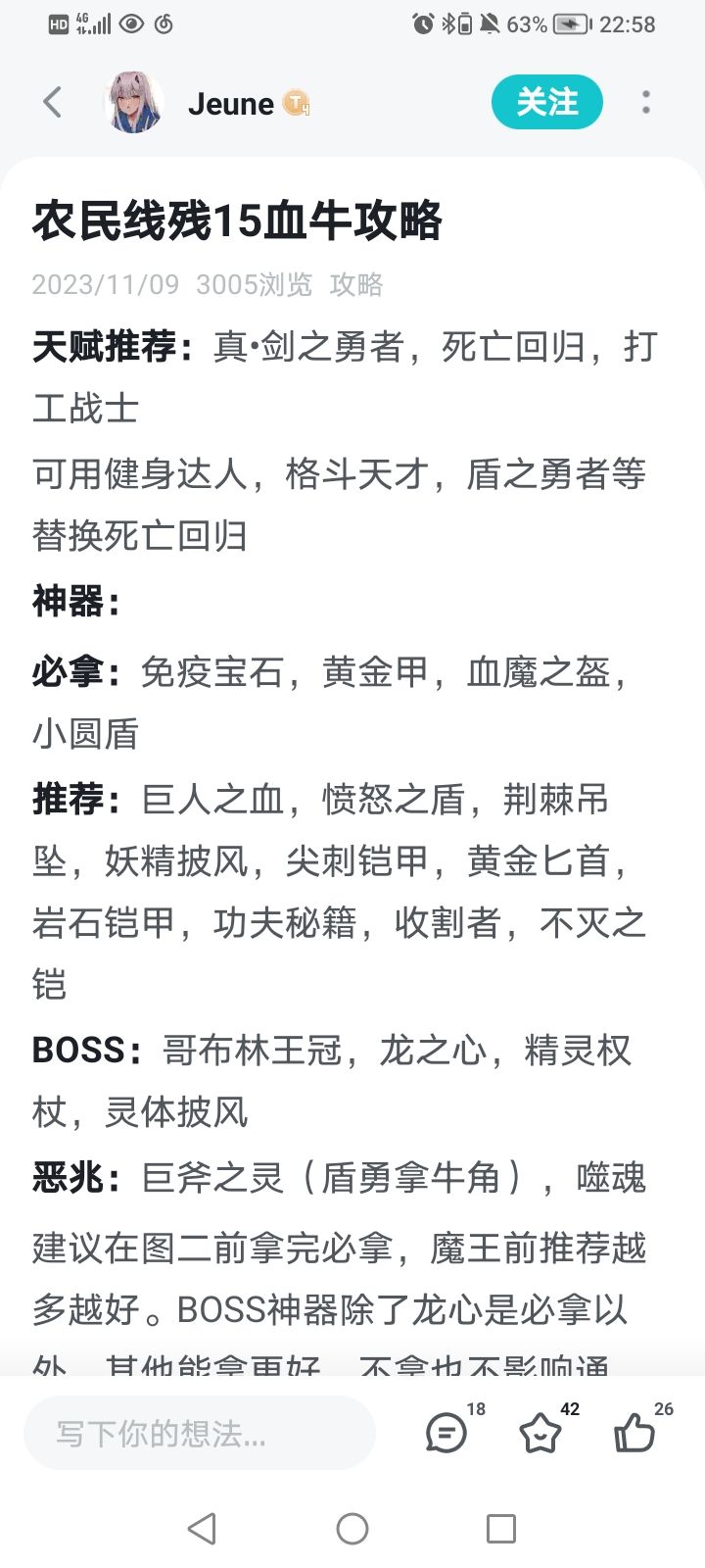 为什么选择6到15?因为这一阶段可以锁定2天赋,更容易拿到固定搭配,流派可以发挥威力。 农民,残酷6到11可以压血,也可以血牛(邪健打最好)压血可以看光阴的角落的攻略。残酷12到15推荐血牛,可以看Jeune的攻略(这攻略天赋一换成邪健打就能打低残,所以说血牛才是农民的版本答案啊)。当然我血牛的经验和他不同,可以看我别的帖子。猎人,残酷6到8适合光阴的角落的攻速暴击流,推图巨爽。但是以我的经验