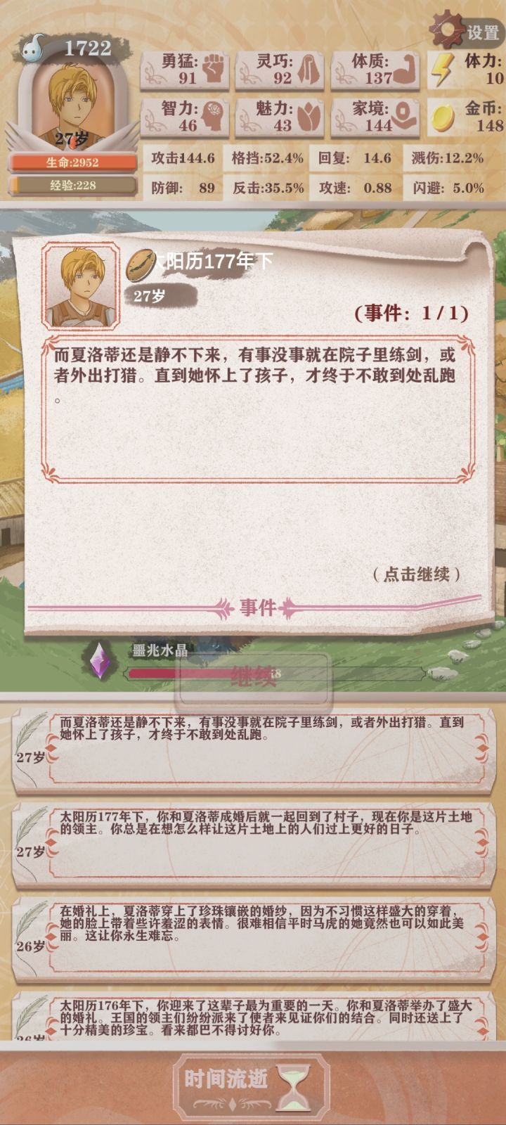 看我截图剑圣最后懒得打了,感觉能通关就提前去魔王城打boss。然后露娜好感度还没刷满,又就选择和夏洛蒂共共度余生。嫁入了贵族,当上了领主,有自己的领地,还生了一个孩子叫雪莉😍😍,最后50岁居然就结局了,好多年一直点一直点也都点的手都无聊了,给个官方小建议,要是搞点加灵魂的彩蛋,在最后结局这几年就有意思了,活个几百岁,每日不用点属性自动修炼,每次下个回合就自动加属性,然后加属性,然后还可以继续冒险打怪,加超多灵魂,那多爽,直接就是一个千年老妖属性叠加上千,打怪重复刷,一招秒😅然后再给一个老死自助选项升天加灵魂 哈哈哈哈哈哈