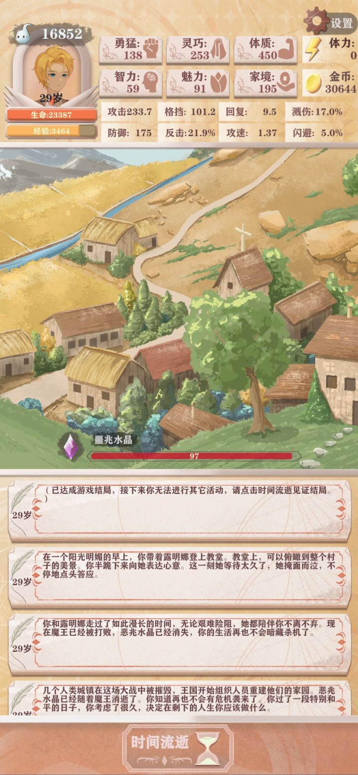 前期有神之子提供各种属性加成,所以可以放心将体力用在智力和魅力、家境及父亲的好感度,便于升级和赚钱,中期钓鱼发力(这个我是大部分吊到传说鱼)后,金币和遗物不断增加,后期点石成金所积累的大量家境让金币越来越多到可以用钱在该回合买满属性加成,流派建议格挡反击流,这样就不用花钱在灵巧上,还可以在买满其他属性加成的同时可以去买神器。