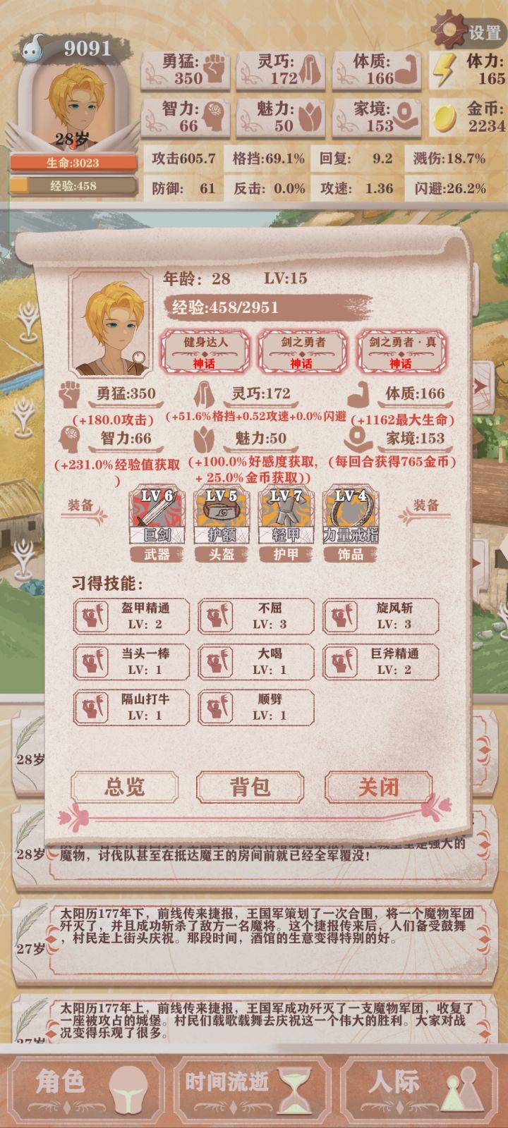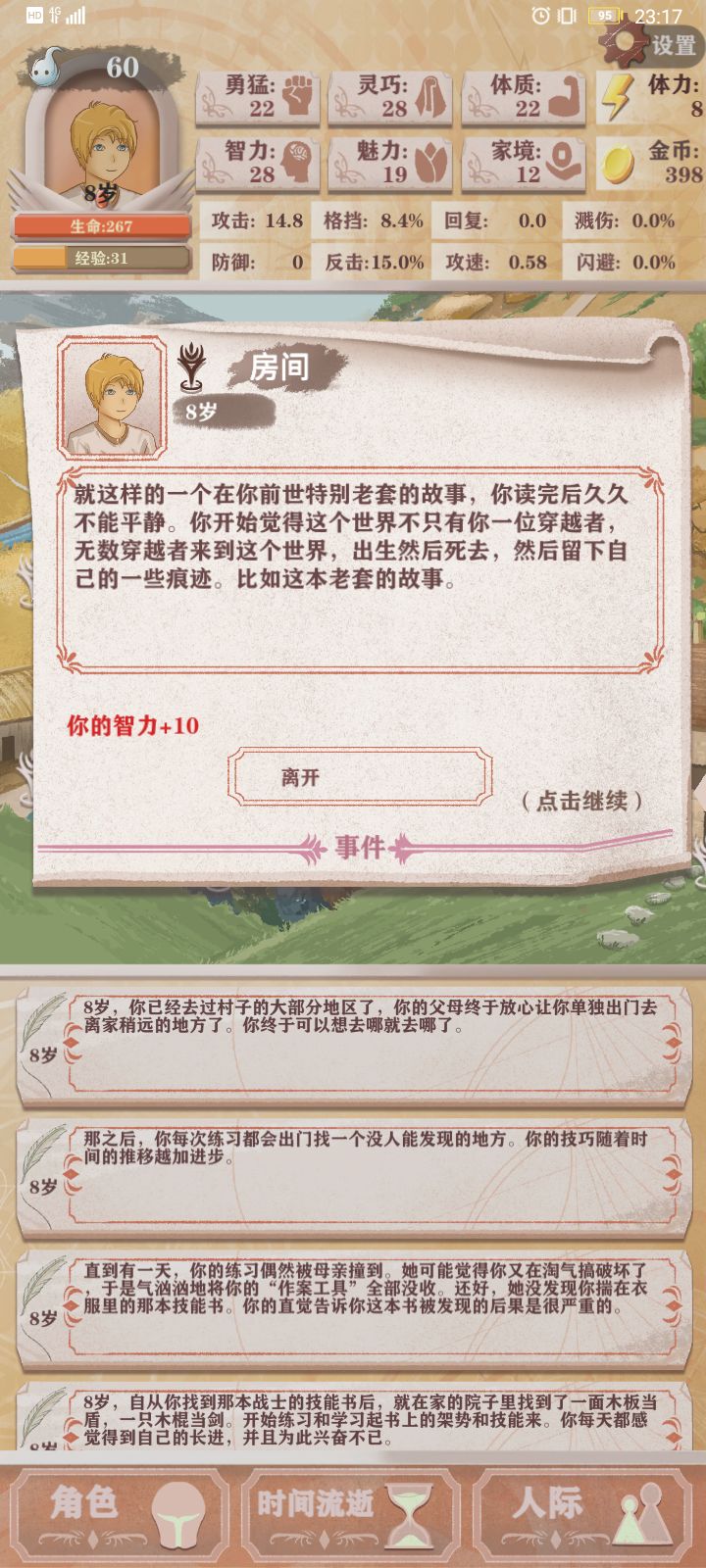 天赋:双剑勇健身达人我没拿全遗物,兽人山脉3个遗物没拿,王室怨灵没打,魔王轻松过,前期会有点小坐牢基础属性如图一局下来没有拿到弃甲,本来想拿的……10岁之前只管刷体质,其他的别刷,可以拿零花钱,有多余的体力就读书等10岁开始就每天先锻炼2次体质,体质先刷到100,去做事只去驿站,每天都去酒馆加体力,别做服务员,太亏刷到100体质后就只管练力量,遇到丰收祭摔跤就去,小巷买体质买到400就