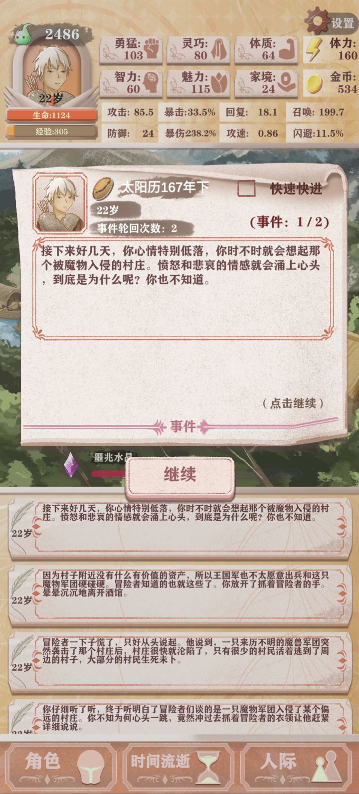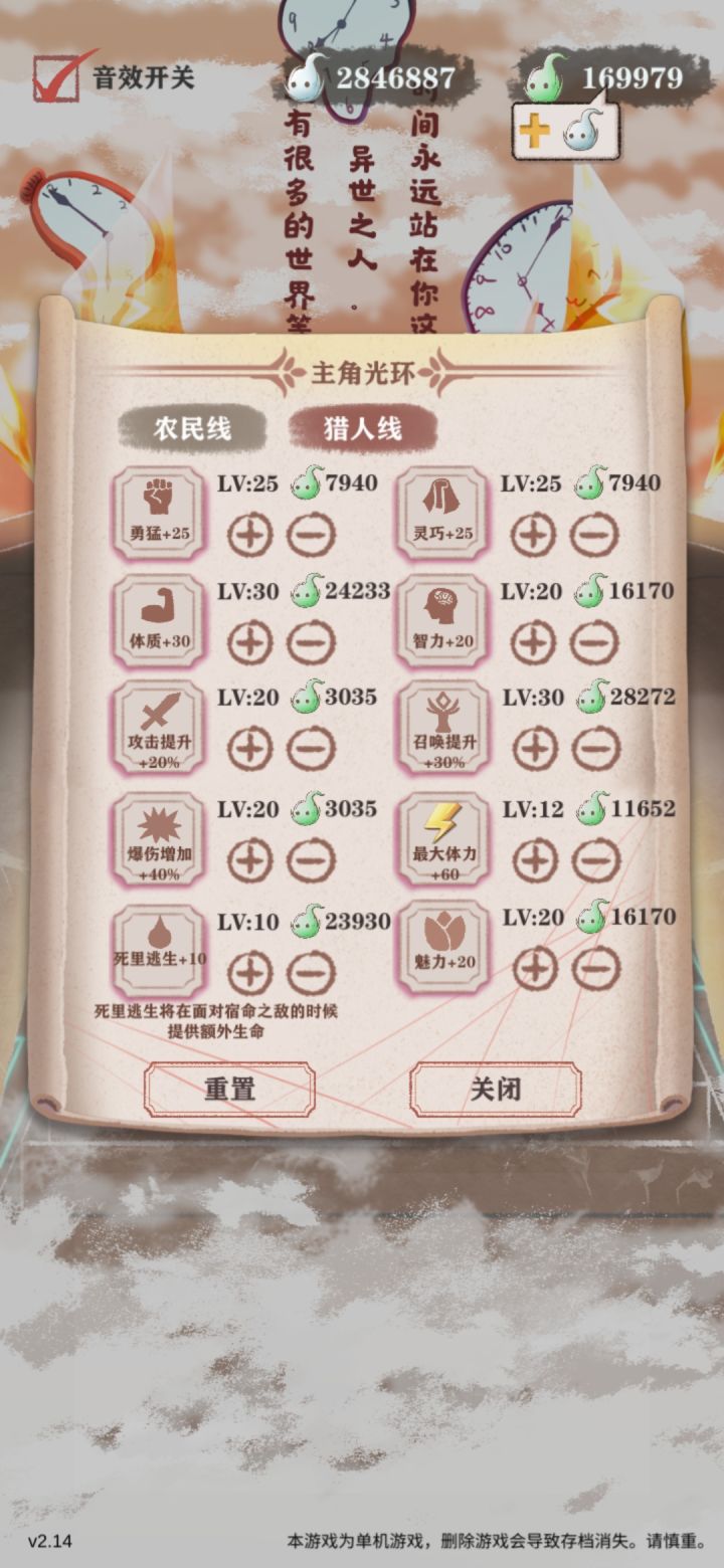 天赋:弓之勇者,直死魔眼,健身达人 遗物:攻击类全齐(收割者、猎杀者、袖箭、战鼓、黄金匕首等,猎杀者和袖箭一定要拿到!t0!),别的随意,复活石可以有因为打魔神的时候如果运气好能多出小几百甚至近千的攻击力(没测试过,估测);另外开局得拿鬼娃替身 (建议高残走这种打法的话,第一个副本就把猎杀者刷出来,其他两个遗物攻击类即可,然后前两个副本的六个遗物都sl大法刷成攻击类) (就是刷得麻烦,这次通关我好像打了快6.7.8个小时吧,没留意) 光环:看评论区发图 下面是开局操作: ①10岁前全点智力,注意刷老爸好感,果子吃暴击的 (三岁时父亲的好感事件如果你体力不是刚好20倍数的话,建议别点) (刚开局刷睡觉,sl大法刷够三次做梦梦到农民线的村庄,刷够能多3智力) ②10岁-13岁都点父亲好感15体加1智力,然后开始锻炼 (勇猛后面每回合两次点满,体力不够的话就舍去灵巧或体质,保证后期输出上限)(前期灵巧和体质轮流点,体质加到五六十就可以停,然后两次都只加灵巧,)(灵巧加到一百就可以转多打工赚钱了,这时候基本都后期了;码头卸货勇猛越高钱越多) (勇猛必点,遇到篝火跳舞事件建议少点一次灵巧或体质点上跳舞,后期如果运气好拿到帽子的话献祭攻击力会有颇可观的涨幅) (灵巧主要是为了攻速,体质则是前中期保证生存能力,后期魔神配合父亲神器多抗一两下提高输出空间) ③10岁开始每回合留体力赶路和20体下副本 (忘记几岁来着,智力到54以后给的经验直接升级,建议是点一个动物或植物多抗两下,第一次下副本sl一下,刷两三个普通怪有了装备就篝火跑路装上) (一定要记得提前装上武器!!!!) ④14岁后多余体力点魅力 然后就是……我刷太久了忘具体了,有缘再补吧,这种流程多刷刷也就熟了,不用动脑手指自己就会动…… 结尾。我这种打法残8应该是能稳过的,不过我的数值没有刷到理论最高,而且装备也不是最好的(这个建议忘记七八岁来着,还没过残7解锁成就的话sl大法刷出独角兽事件,不然刷装备是真的很难受的) 残9凹凹数值应该也能过?……不过我没打过,农民线残5来着好像。 就是硬云。 折磨结束了,猎人全成就,睡觉去。 还有农民全成就等着我呢。
