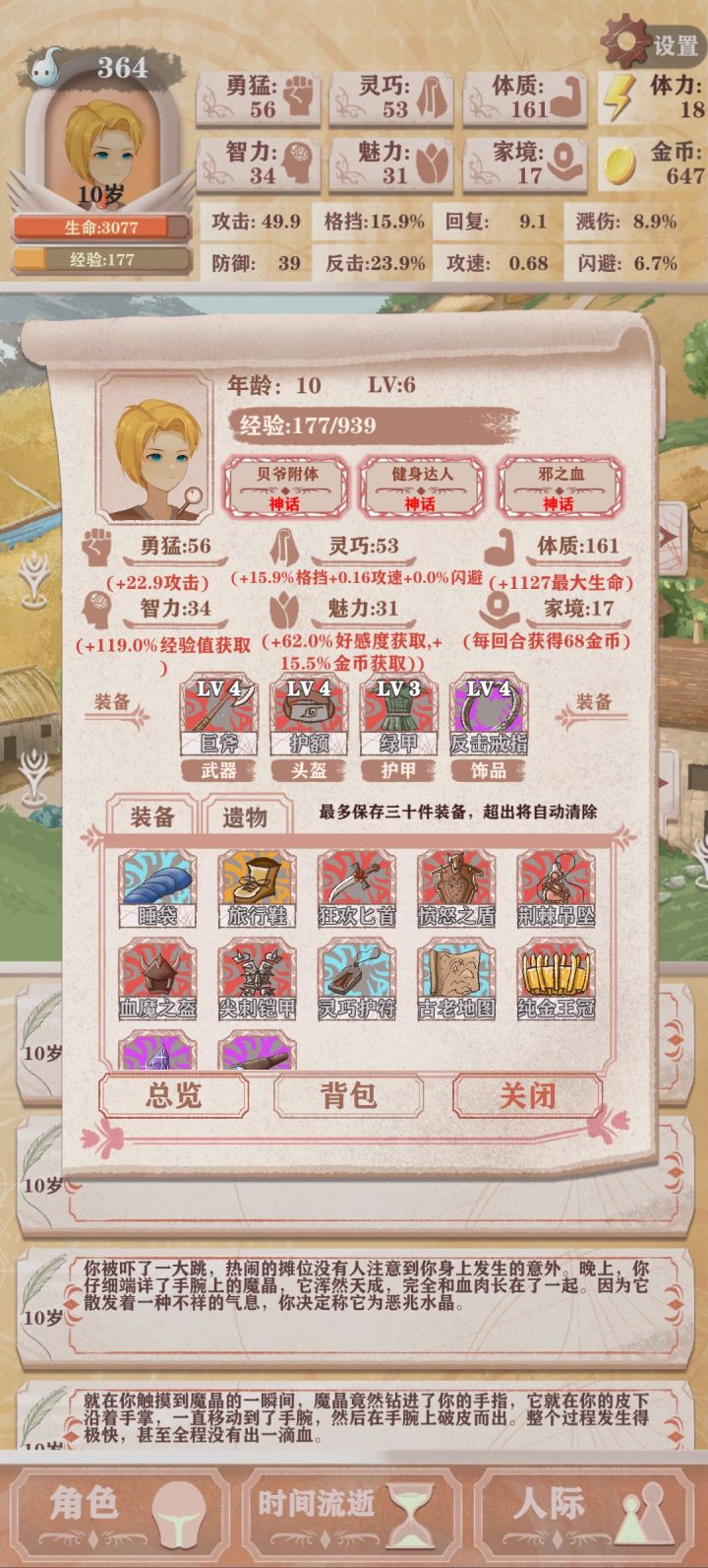 前中期都很强 堆体质灵巧 技能双持、反击姿态等减攻速的不学。 核心技能嘲讽,格斗+高防+嘲讽 达到夸张的减伤效果,真剑填补了输出方面的疲软。前期老样子爬来爬去跑来跑去练体质 但这一次魅力值同样重要 不需要刻意为了堆体质硬跑。魅力值上来了才能保证全局买体质药剂的同时攒出2w+金币(这轮玩到最后,可以攒到近2.5w金币)。10岁穿上装备血量差不多在1700左右体质点到进图血量2000多不到300