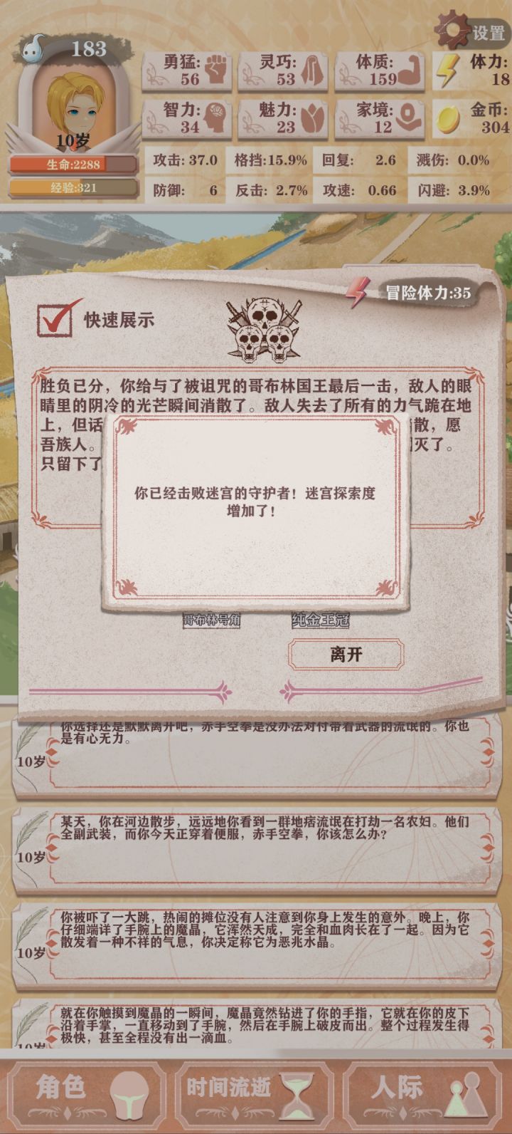 之前看到有人问10岁能不能打死哥布林国王。于是今天就试了试普通难度。第一次用的贝愈盾,打到国王了但是没打过。第二次选择了贝邪健,9岁SL丰收祭赌钱赢了两次,加上贝拉每回合都在家,才凑够1500买睡袋和鞋。如果只是单纯的想10岁过国王,我觉得可以把健换成点金,这样起步资金会更充足,买完睡袋和鞋之后还可以买脚程。