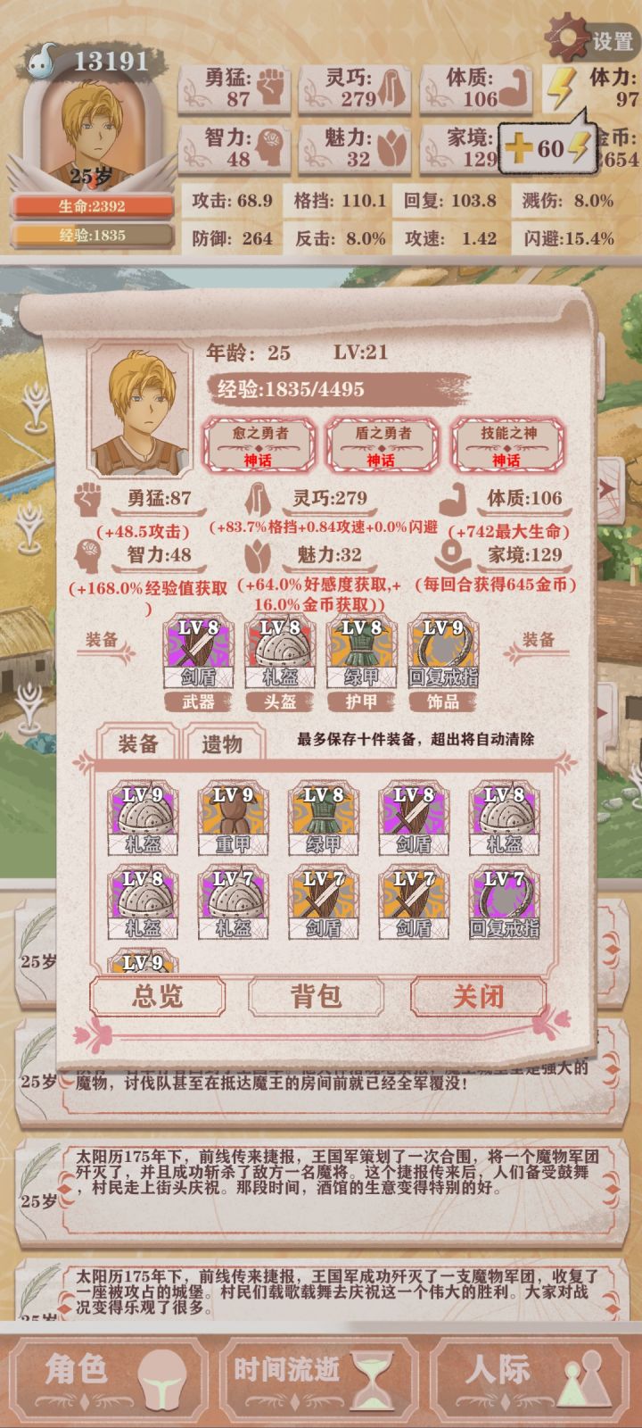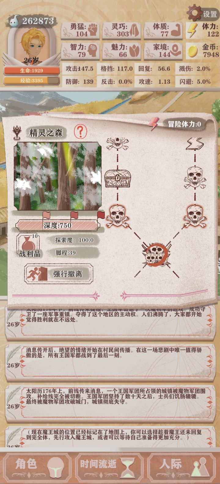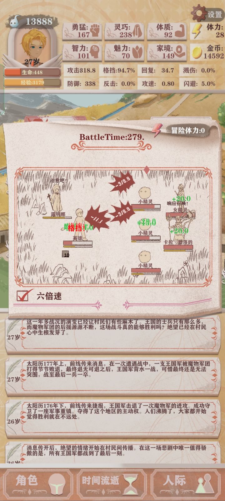 0体力连续打2个精英怪1个普通怪顺路把剑圣打死。眷属0死里逃生,魔王用2死里逃生(没办法弃甲流打魔王就是会垃圾点,有点难做到0死里逃生)问我为啥那么快通关,以及灵巧为什么这么高,看以下运营视频。初期家境感叹号不做,因为不需要太多钱,当然魅力感叹号还是要做做,10岁后也不给小朋友买糖。拿着lv4~5的装备打完团长才去把精灵王切了,自己属性能打死boss后就不下副本,有10回合左右不下本All