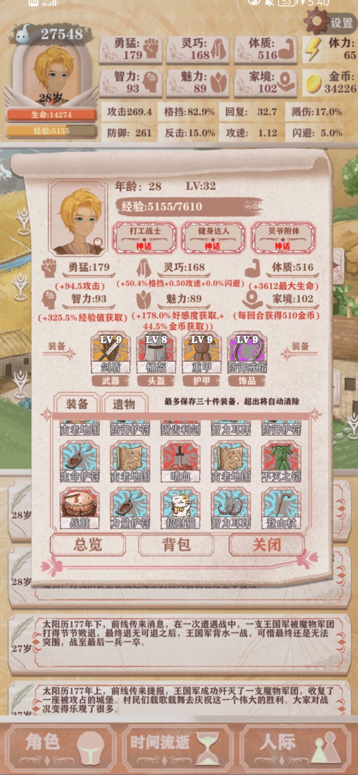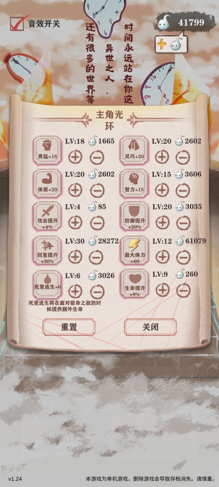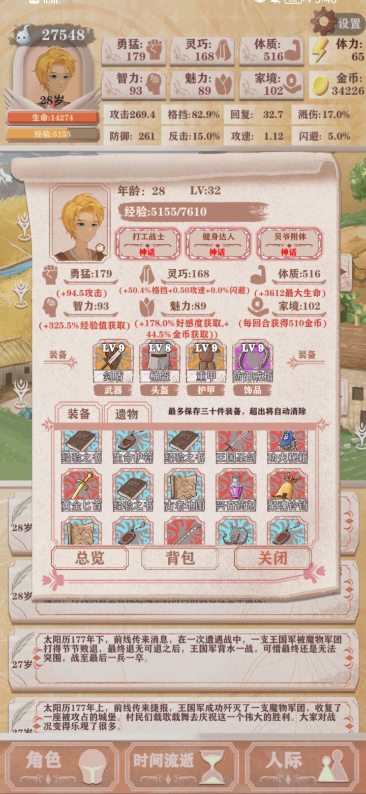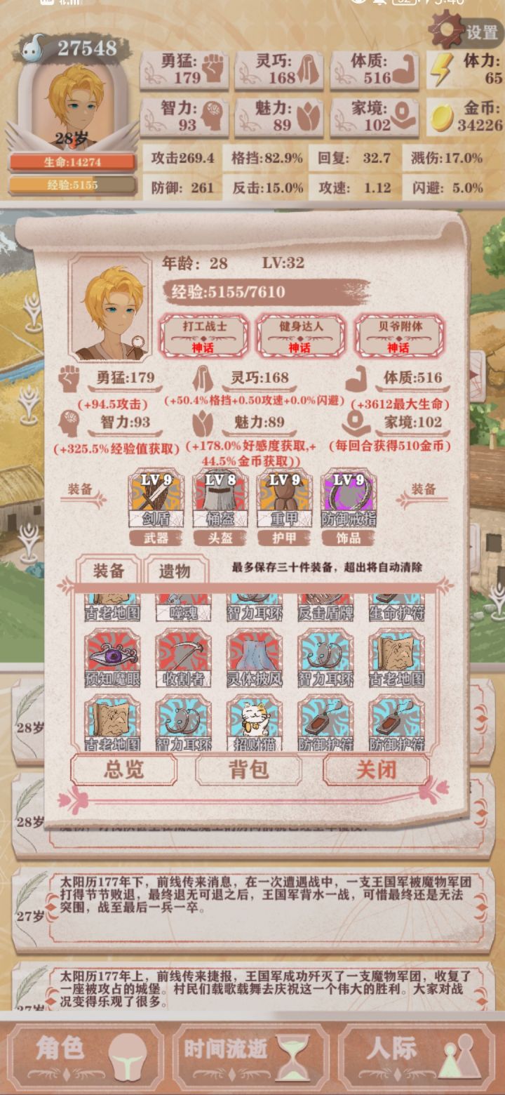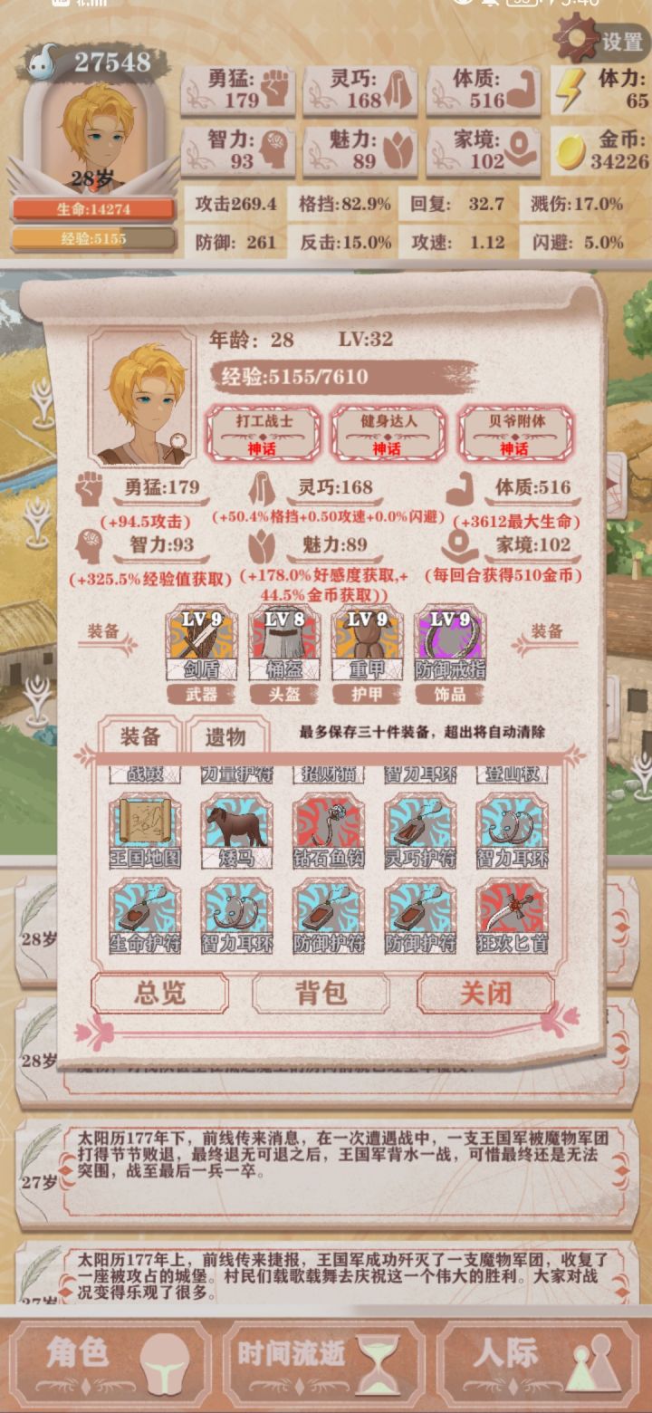 残八成功收集全部红色遗物(ps:除了boss二选一少的那几个),因为到最后两次旅行商人都是空手来的,所以应该是收集全了。打工健身yyds,为了刷魂还带了贝爷,残八目前就是我刷魂的极限了(光环等级不够),残九想打剑圣就得打工健身配剑勇,技能,智慧这些了,带贝爷只能一人之下了。
