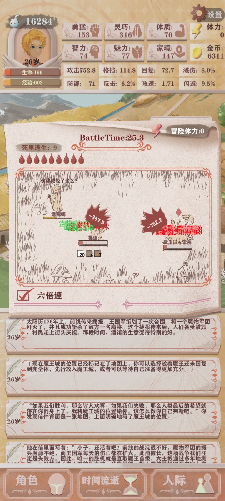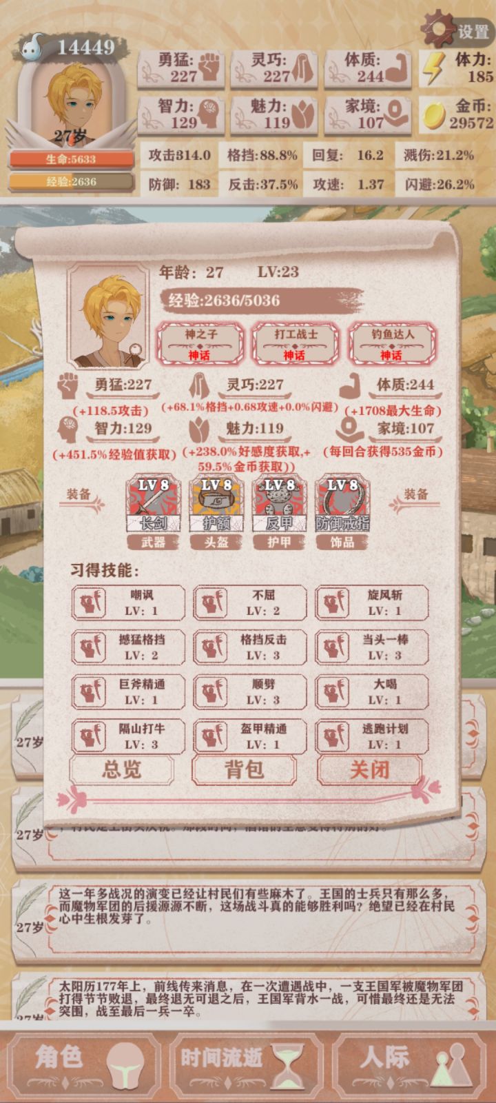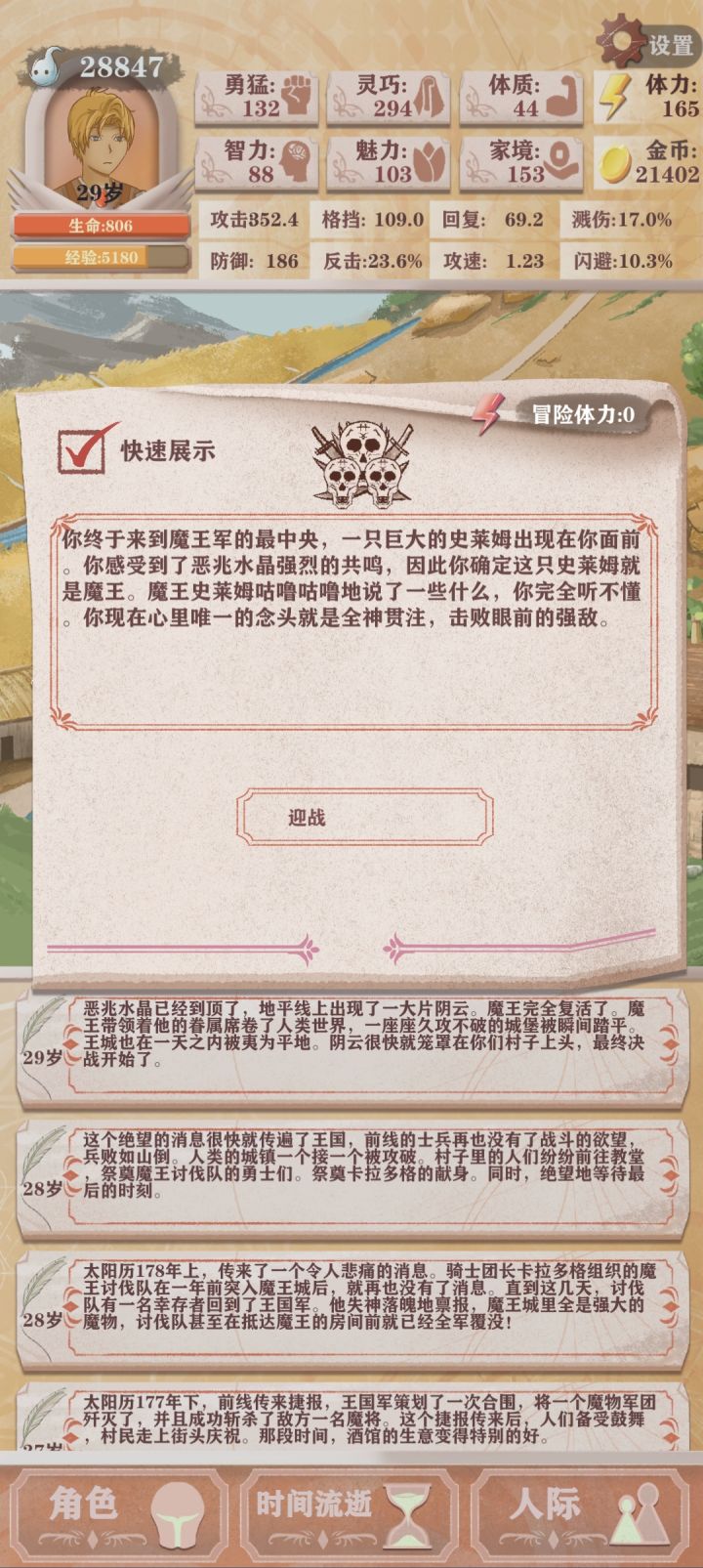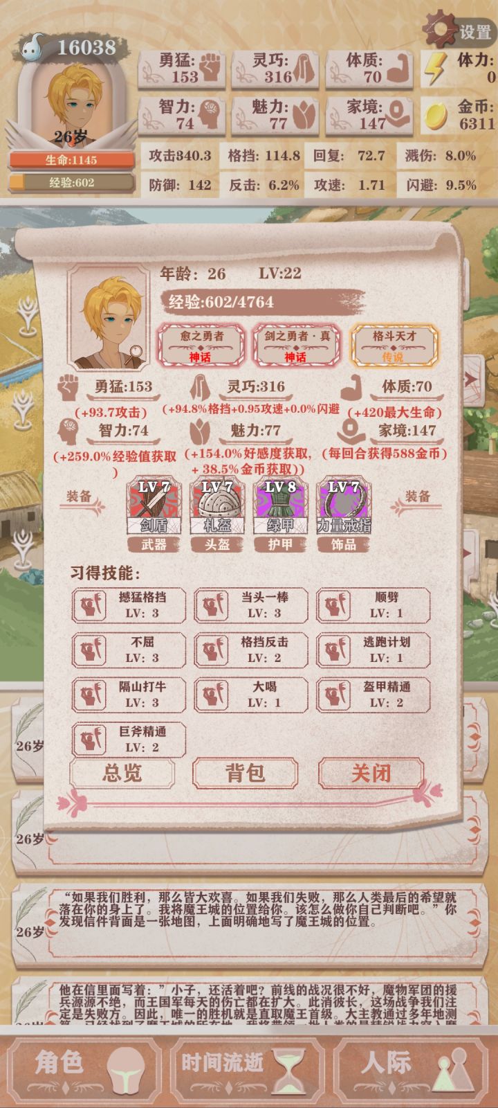 基本知识:勇猛+攻击,体质+生命,魅力+酒馆服务员所得/唱诗班所得,家境+每一回合初始所获money,智力+杀怪经验,灵巧+攻速/格挡概率-----------普通版(高攻击稳定打法)----------------^^^^^^^^^^^^^^^^^^^^^***************0-5岁:院子选玩玩具,+灵巧5-7岁:与母亲互动+好感,与母亲要零花钱+金币,房间看书+智力,居民区