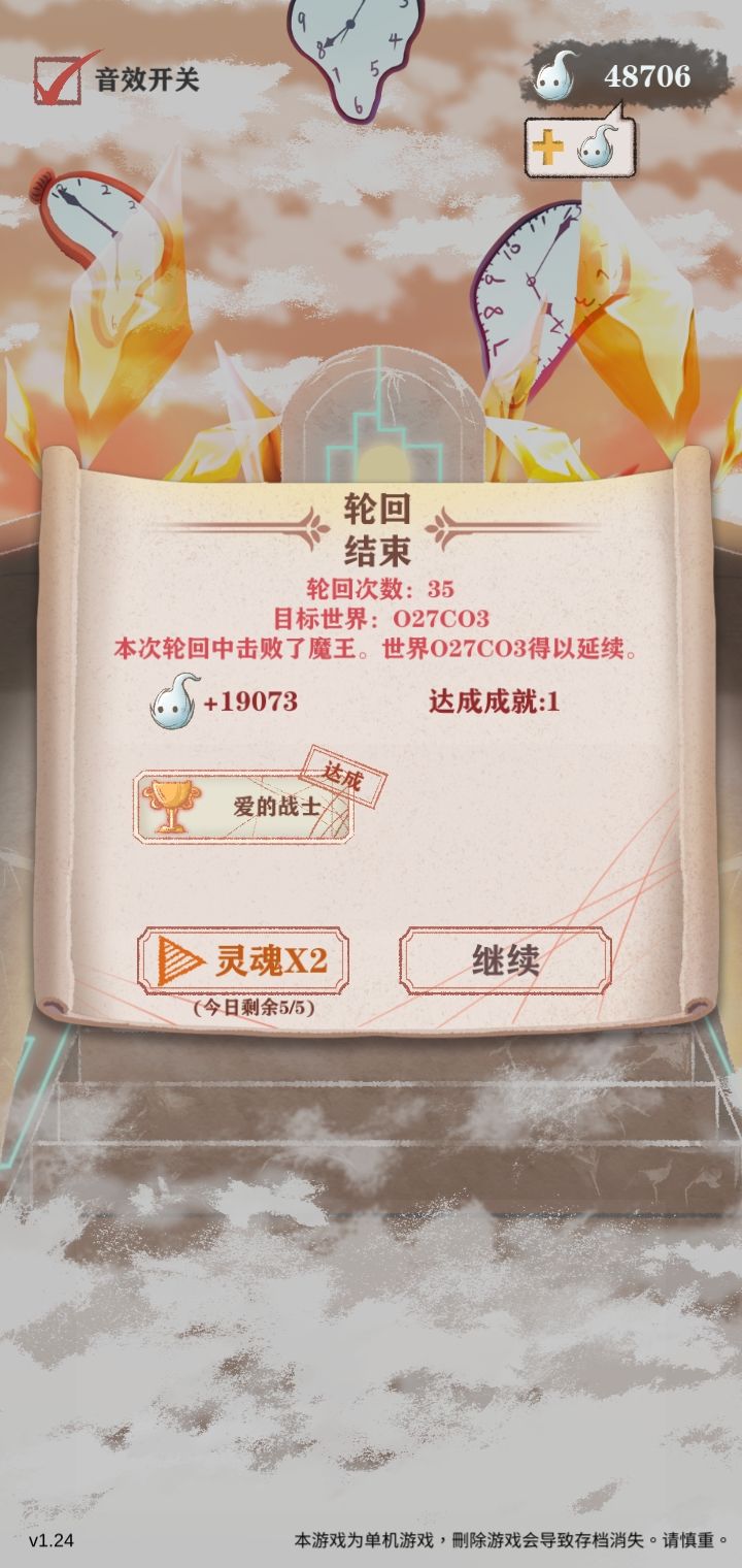 打了两遍,第一遍玩过头了进度满才打,遍地全是眷属,打到魔王的时候只有两条命了没拼过sl也没用,第二遍26岁试了一下没过,27岁买了两个遗物,再加上图里面打了两个遗物就过了。