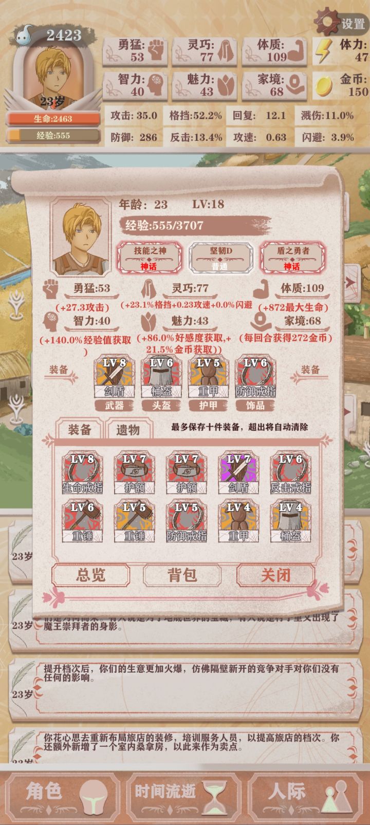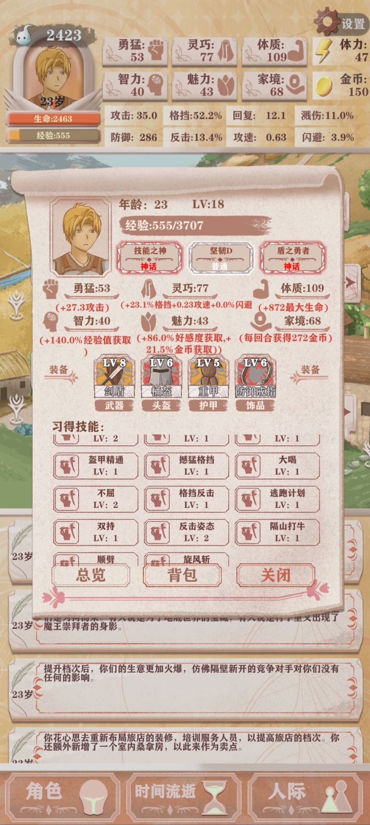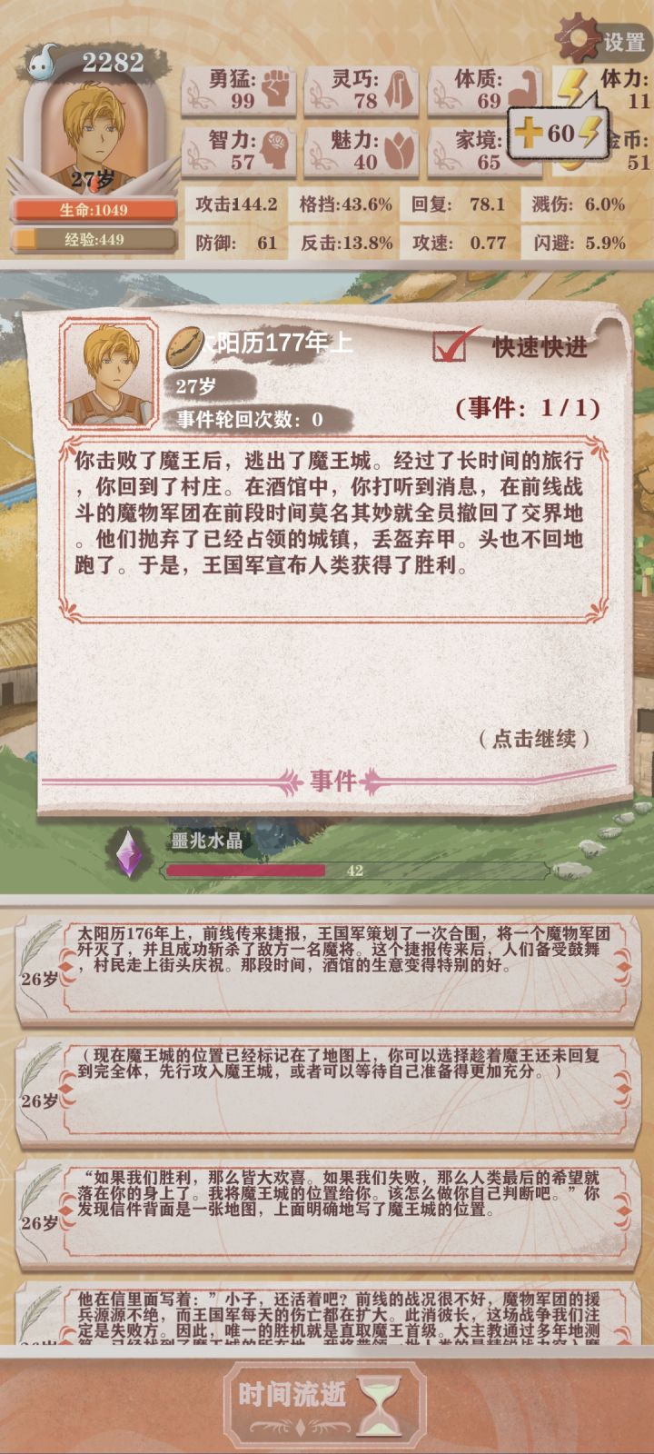 打魔王前两波的完全体,打魔王时防御力,高达460,平a高达300,56的格挡,50反击,再加上近30,每秒回血,天赋除了弃甲没弄,都拉到了,最后一波魔王,甚至连我1/10的血都没打掉,盾之勇者随便打,无脑堆防御就行,有防御力加成都拿,减伤还有对面负面状态的也要拿,免疫水晶非常关键,不然幽灵聚合体打不过,还有那个无法闪避之刃,第二关必备,第三关盾反,愤怒之盾,必拿,剑圣那关堆防御就可以过,然后国王骑士也一样,魔王更加好打,需要注意的是,前期堆属性的顺序,35点体力,不然奶妈会死,35点灵活,抄近道打第二关,50点力量,你的剑勇需要,时刻要存500到600金币,商店出来的神器很关键,智力一定要高,刷等级才快,有红色钓鱼天赋的,一定要把钓鱼的那个钓鱼佬两件装备都买了,每次剩30点体力,去钓鱼,运气好,全属性加五