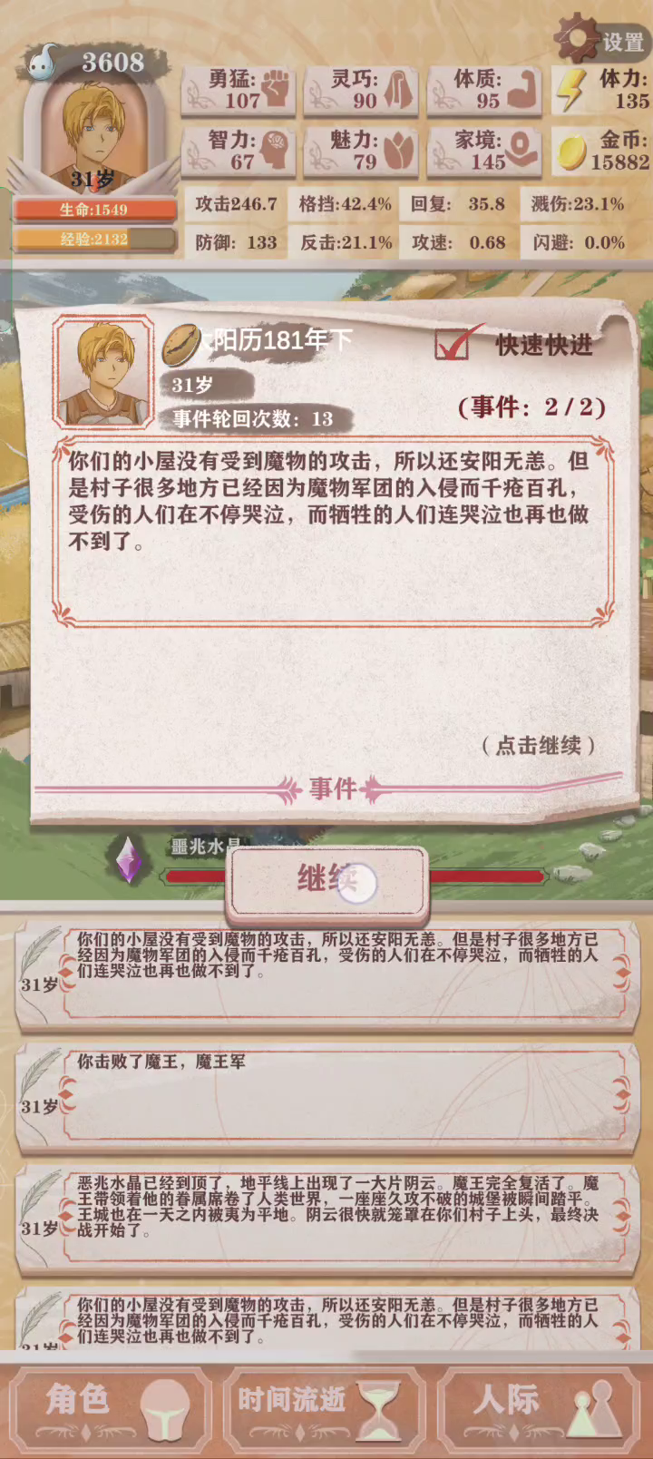 作者这剧情就勇者爹必须死呗,每次打到这里就是死,开一次世界到16岁就死,为啥就不能让他活呢?明明有个奇袭选项了,选了还是死,换成奇袭结果战斗缩短了回家时间刚好把他爹重伤救下来不好吗?还有奶妈呢,救一下啊