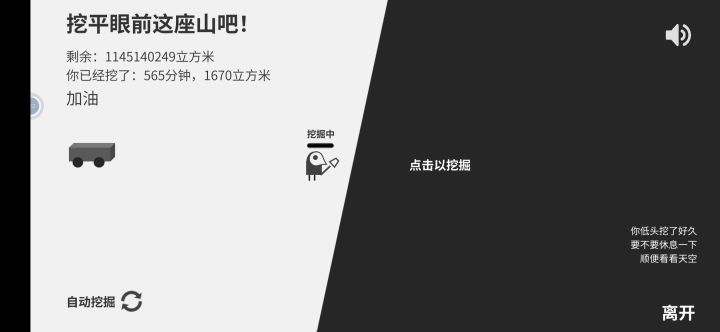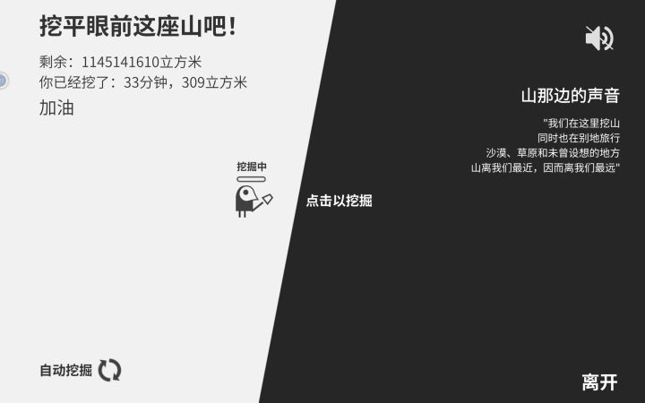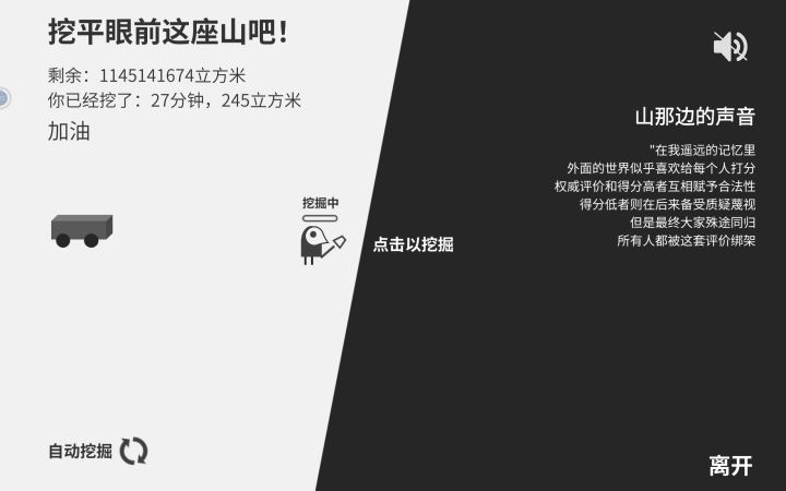 很棒,有些话真的很好,像诗一样,可能因为我个人是一个浪漫主义笨蛋,哈哈,立个flag,今年13岁,希望这一生可以挖完这个山( 。• 👅 •。`)😁😁😁总之,对于我这个急性子来说,真的能让我沉下心来的这种佛系的游戏还是非常少的,我也想对研发团队说声加油,希望你们的公司越做越好,也能多多带给我们一些非常棒的游戏,无奈才疏学浅,语文不好,只能说这么多了,总之是一款很棒的游戏,虽然确实在内容上有些匮乏,但是在意蕴上还是赢的,背景音乐很好,很治愈,可惜我一直关了静音,在后台播放其他曲子,哈哈哈,游戏很简单,就是一直点点点,没什么好说的,也没什么好攻略的,想来想去也没有什么想说的,就这样了(´。✪ω✪。`)