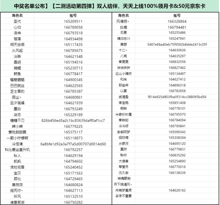 【中奖名单公布】【二测活动第四弹】双人结伴,天天上线100%领月卡&50元京东卡