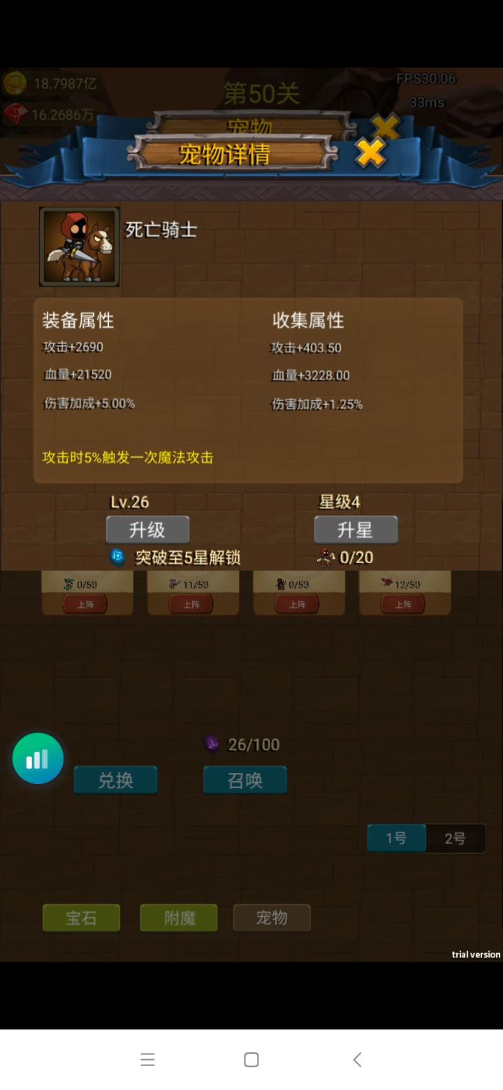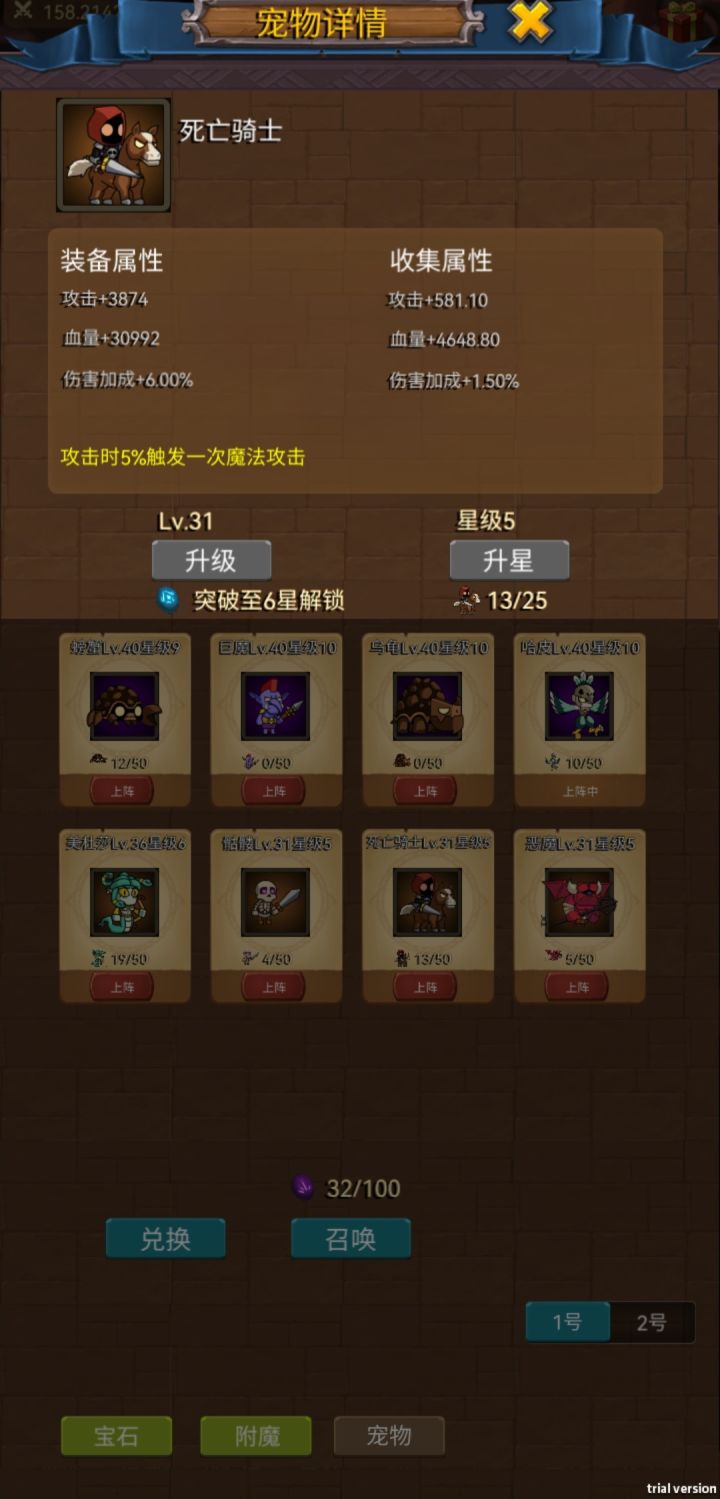 一视频的方式给大家看看各各宠物的属性。主要升级巨魔➕哈皮➕死亡骑士,其中巨魔跟哈皮需要满星满级满进阶,巨魔是加攻击力百分比的竞技场世界BOSS副本用,哈皮是挂机增加经验百分比的,死亡骑士增加战力开图用的。有什么不懂的也可以加企鹅群1015966317欢迎大家