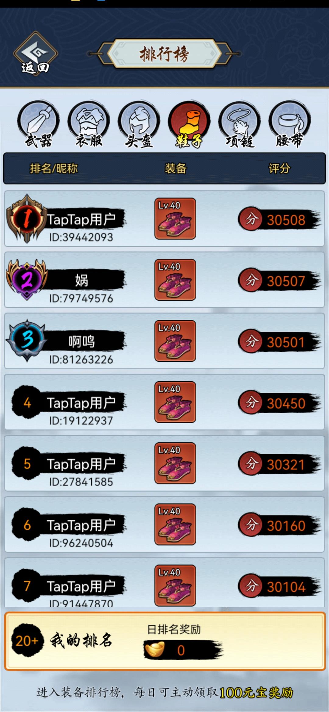 搞不清楚排行榜运行机制,我这里一双40级评分30410的鞋子,为啥不在排行榜上。