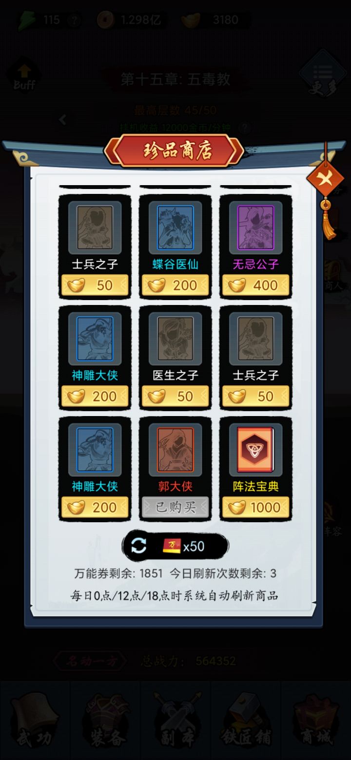 提个建议预设阵容设置完了,可以改成优先出预设的功法吗?对于我们这些前期缺万能的很不友好,浪费好多万能在选功法上,在预选功法上是否简洁一些,比如我想选6内功,6外功,这些可以快速选,省的浪费时间,还有在选羁绊的时候,功法可以改成可以看见门派和武功就完美了,不然预选功法要来回切出去查去找,这游戏对于小白来说,真的太难了,🙏🙏🙏