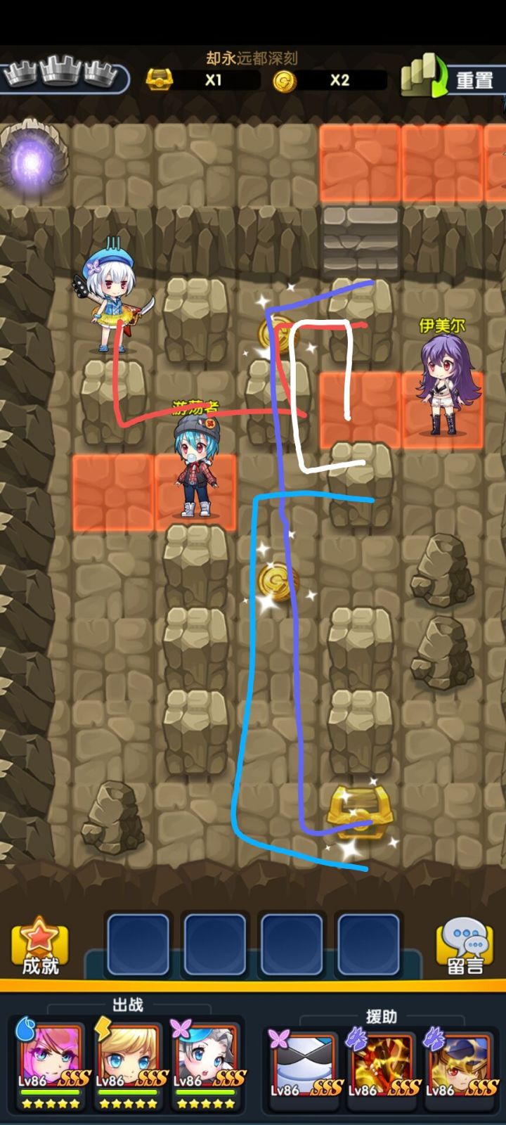 图一是人物的走线,图二是石头的动线图三人物走线顺序按红紫蓝白的顺序走#攻略