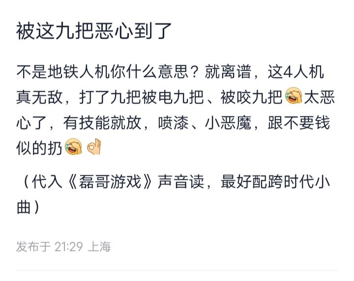 不是地铁四人机你什么意思?就离谱,,这人机真无敌,打了九把被电九吧、被咬到九把太恶心了,有技能就放,喷漆丶小恶魔跟不要钱似的人(代入《磊哥游戏》声音读,最好配跨时代小曲)