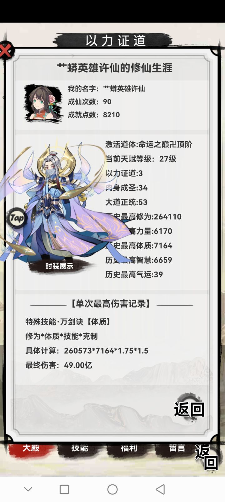 体修7164,伤害49亿,对中庸的体修而言,更对刚玩四五天的萌新而言,还算可以吧?