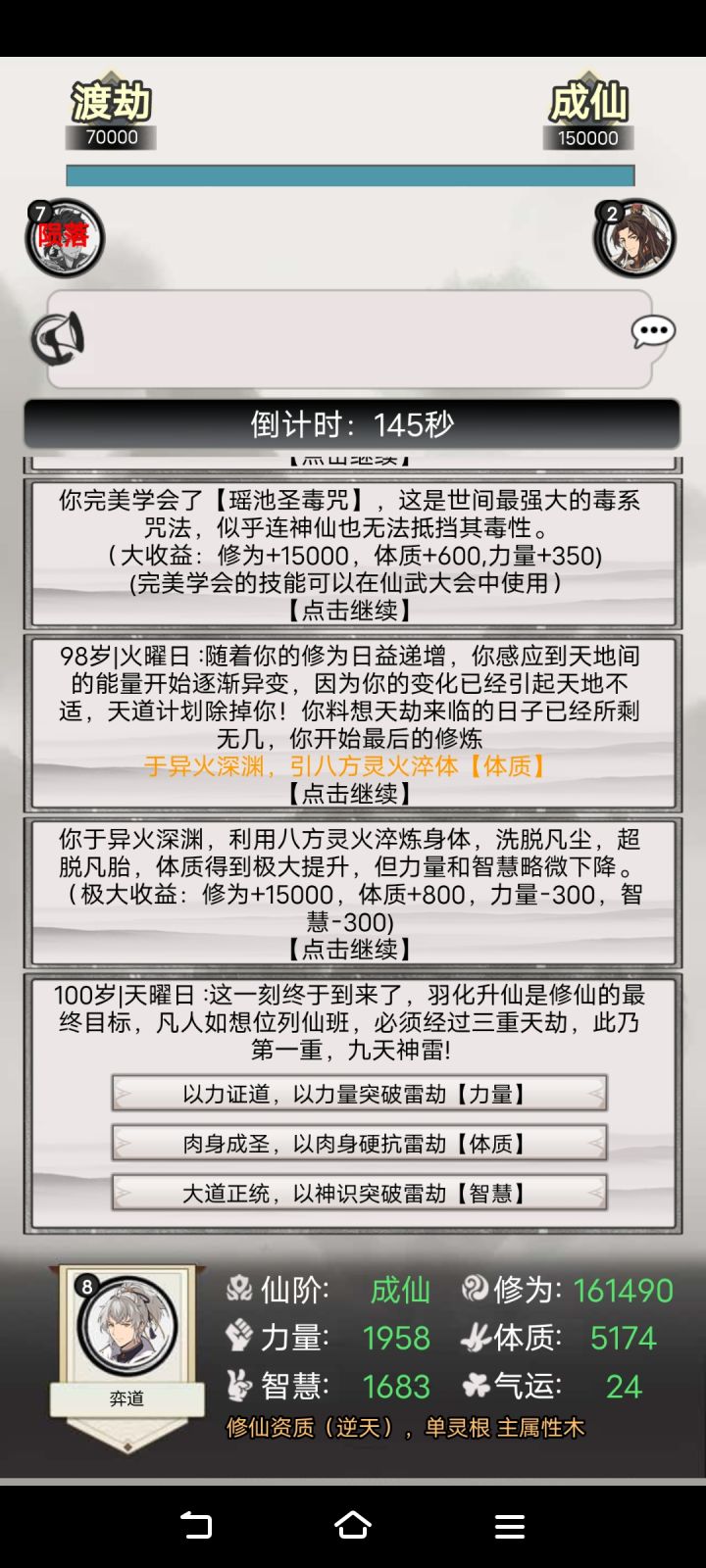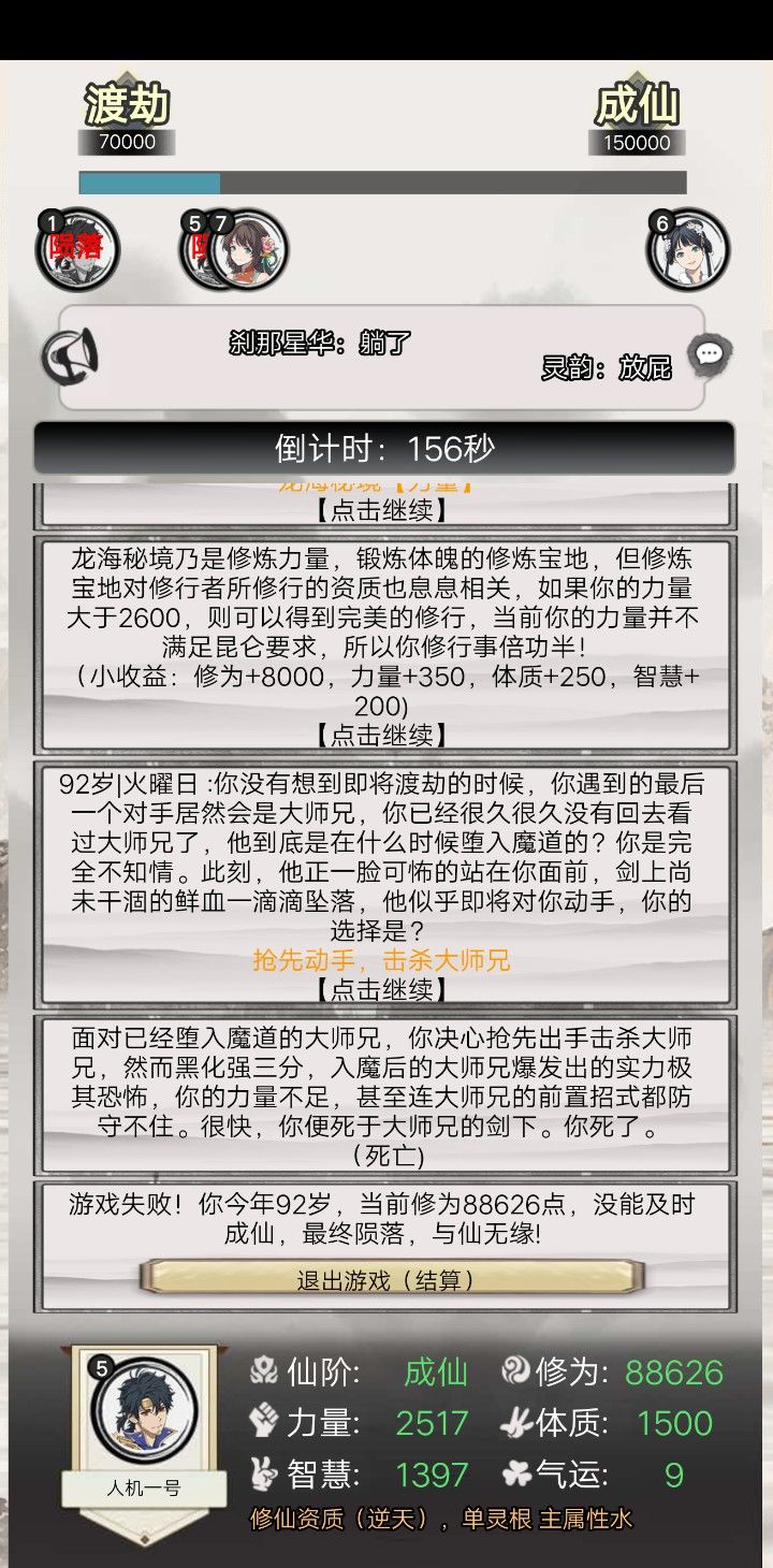 筑基期 遇到邪修 力量没有60+ 不能单杀连续2次遇到邪修 力量都没过60都挂了第一次56力25气运(没有截图)挂了 估计一定只和力量有关和气运无关筑基期的力修60+力量 已经很难了力量60+有较大几率单杀(有死亡概率)