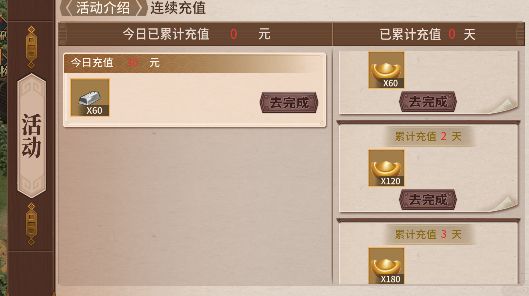连续充值第一天获得60元宝,第二天120元宝,第三天180元宝,第四天240元宝,第五天300元宝,第六天360元宝,第七天600元宝,完整参与七天连续充值活动可以一共获得1860元宝。