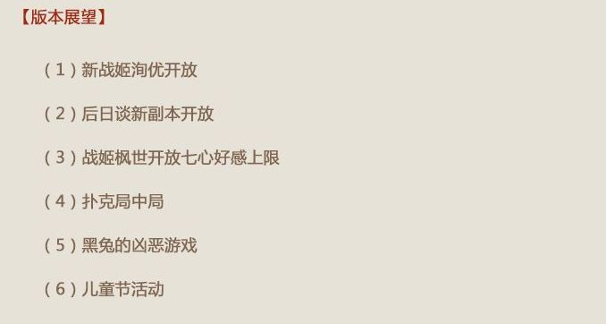 本周更新的关键词是:今后,与你一起……截图是上周已知的版本展望,大伙可以来讨论下:1、董琢开放,按照以往经验一般是看到四星,那么董琢开放的前提条件是什么呢?2、新版块开放。董卓版块已经攻略的差不多了,那接下来的版块主将将会是谁呢?3、枫世八心技能是什么?是不是值得大家猜一波呢?如果梦梦没有咕咕咕的话,很大概率15:00会给大伙揭晓版本展望中一些细节!友情提示,明天更新后会开启“女王杯