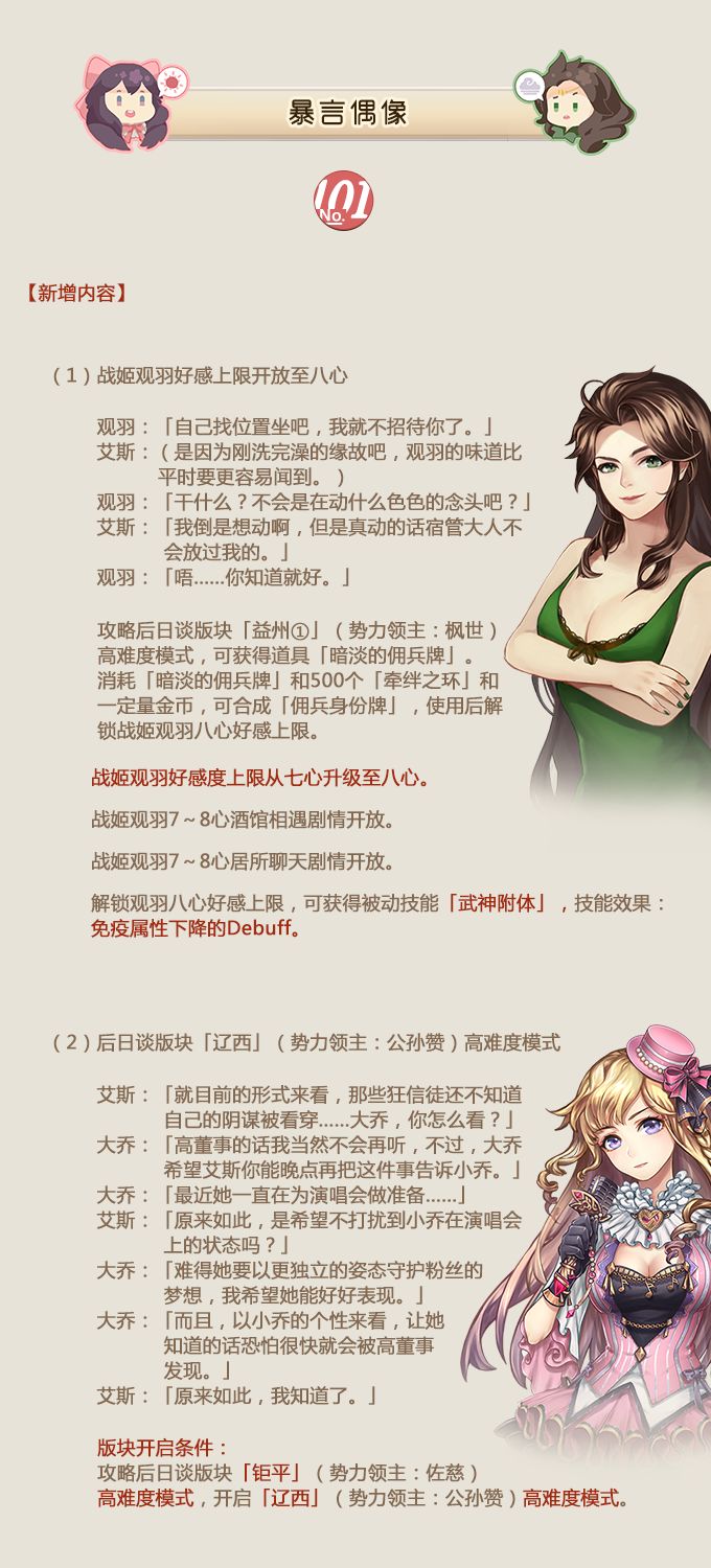 亲爱的城主大大:《姬魔恋战纪》将于8月22日进行更新维护,请各位城主留意更新时间哦!第四位八心好感战姬观羽,本周正式开放了。想了解观羽和艾斯的剧情走向的小伙伴们,千万不要错过哟,据说内容很精彩的呢~本周我们开放了战姬小乔的获取,攻略后日谈版块「辽西」(势力领主:公孙赞)高难度模式,可获得战姬「小乔」。beaut三人组又出新剧情了,本周我们新增了剧情“追寻美丽的食物”,到底讲述了什么样的故事
